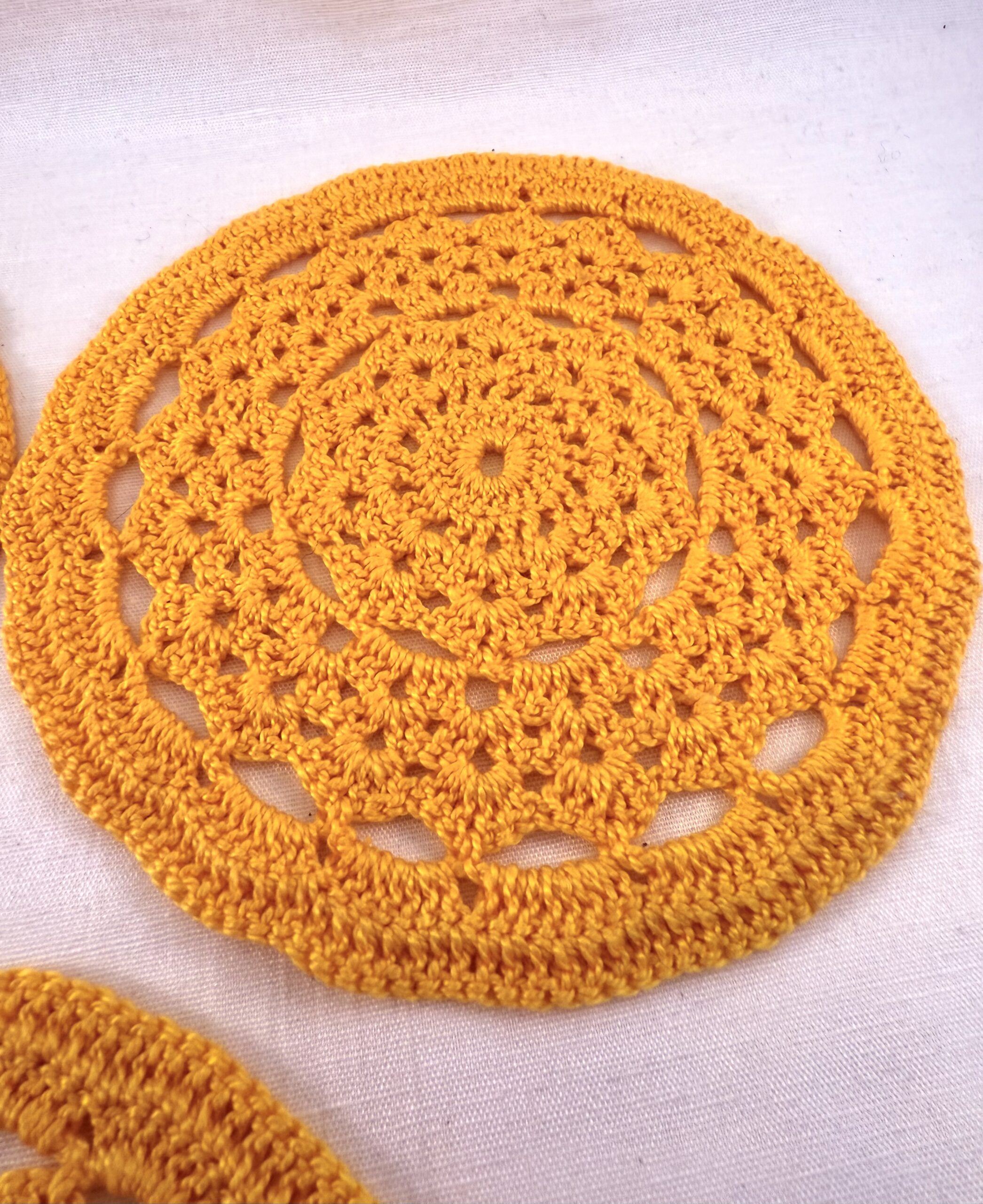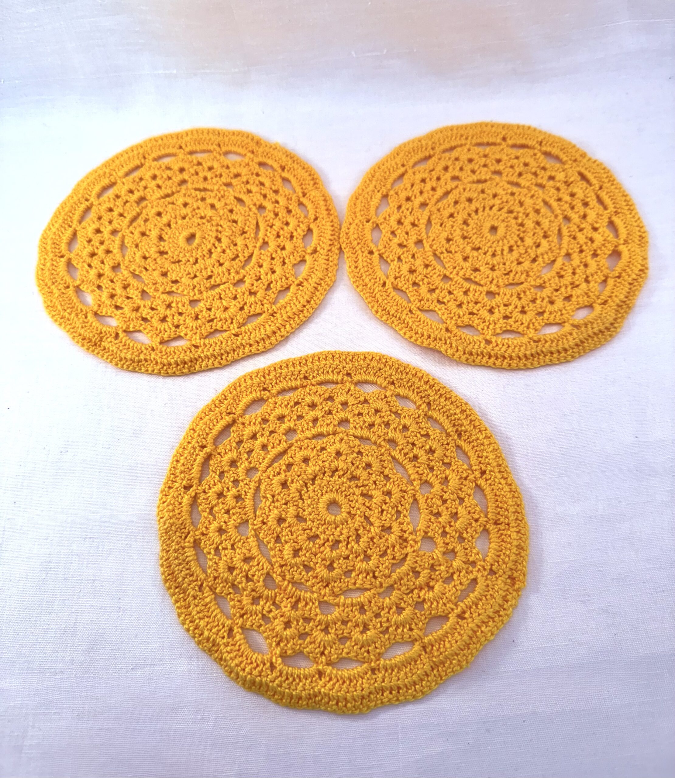 3 stk. smukke, håndhæklede bordskånere i varm gul farve.