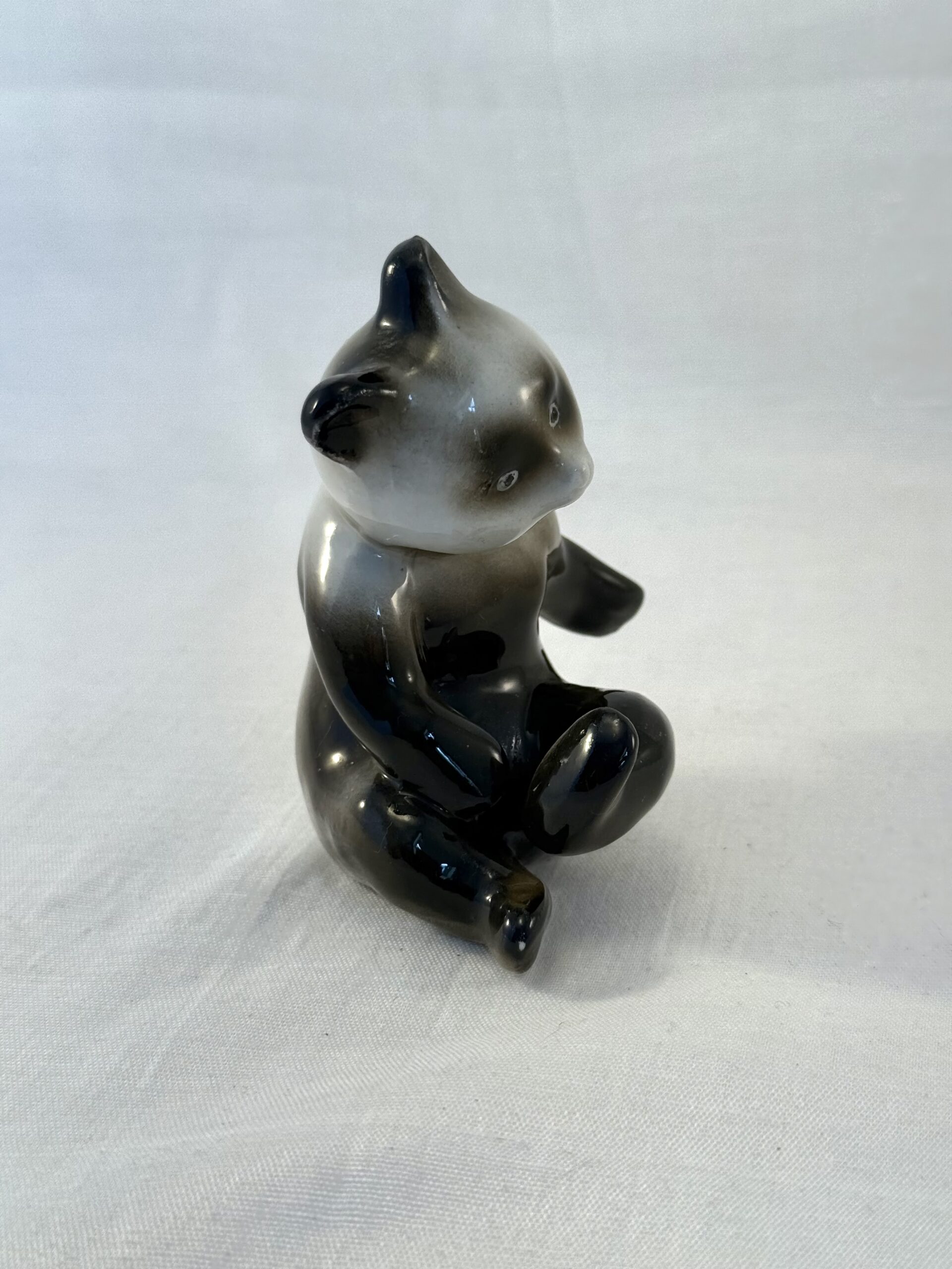 Fin lille porcelænsfigur af en siddende panda i sort og hvid glasur.