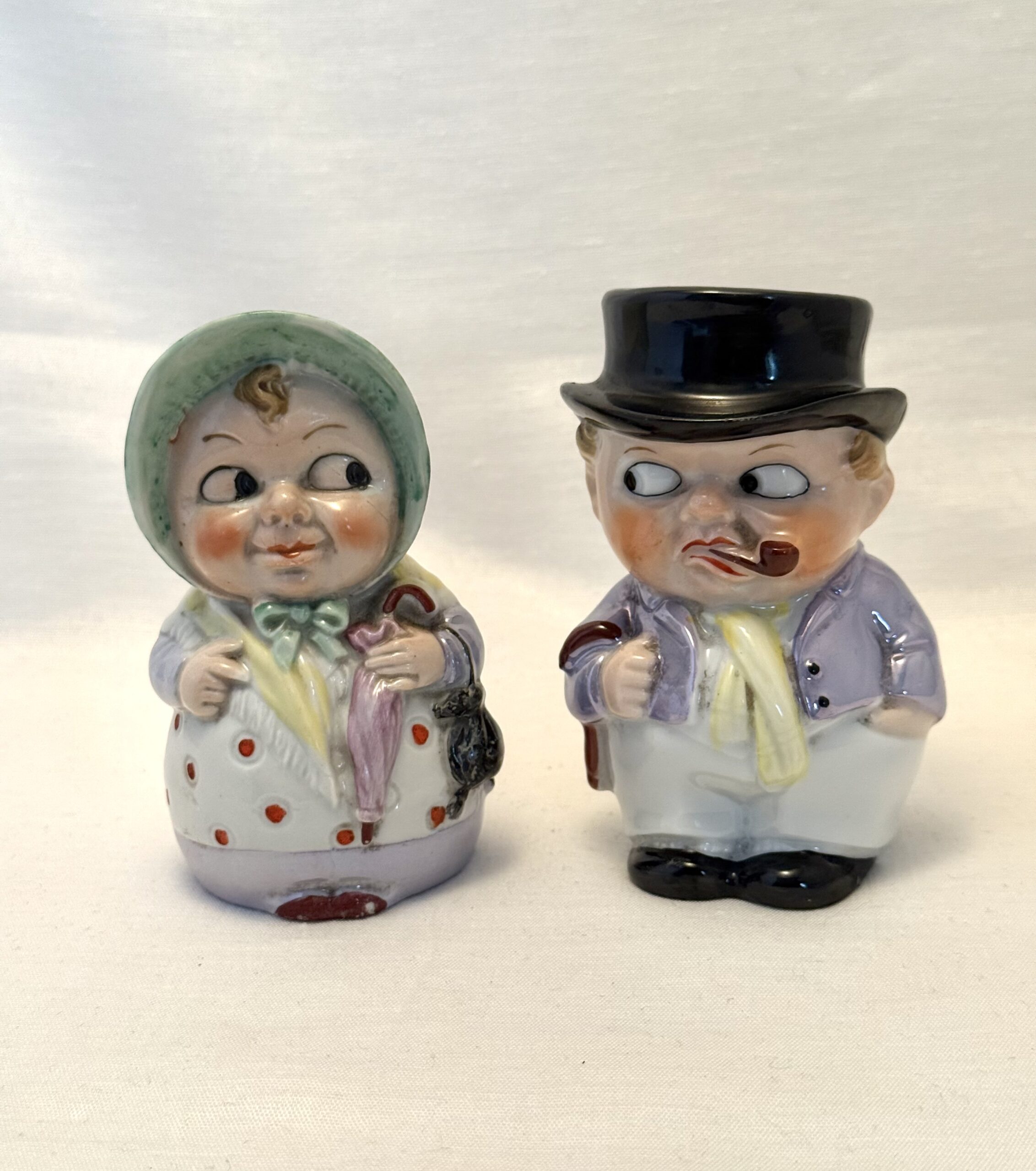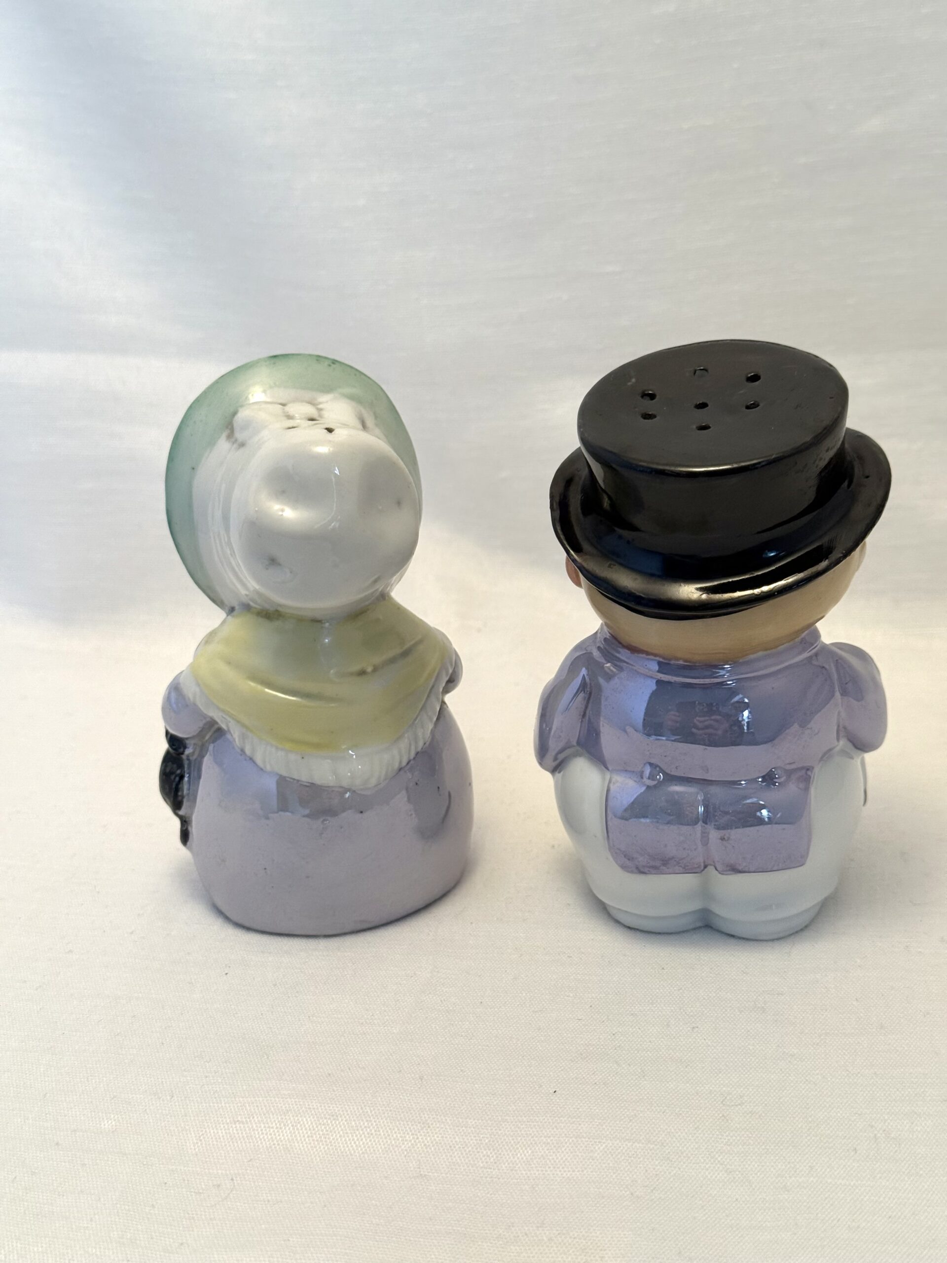 Skønt gammelt salt/peber sæt i porcelæn med perlemor glasur.