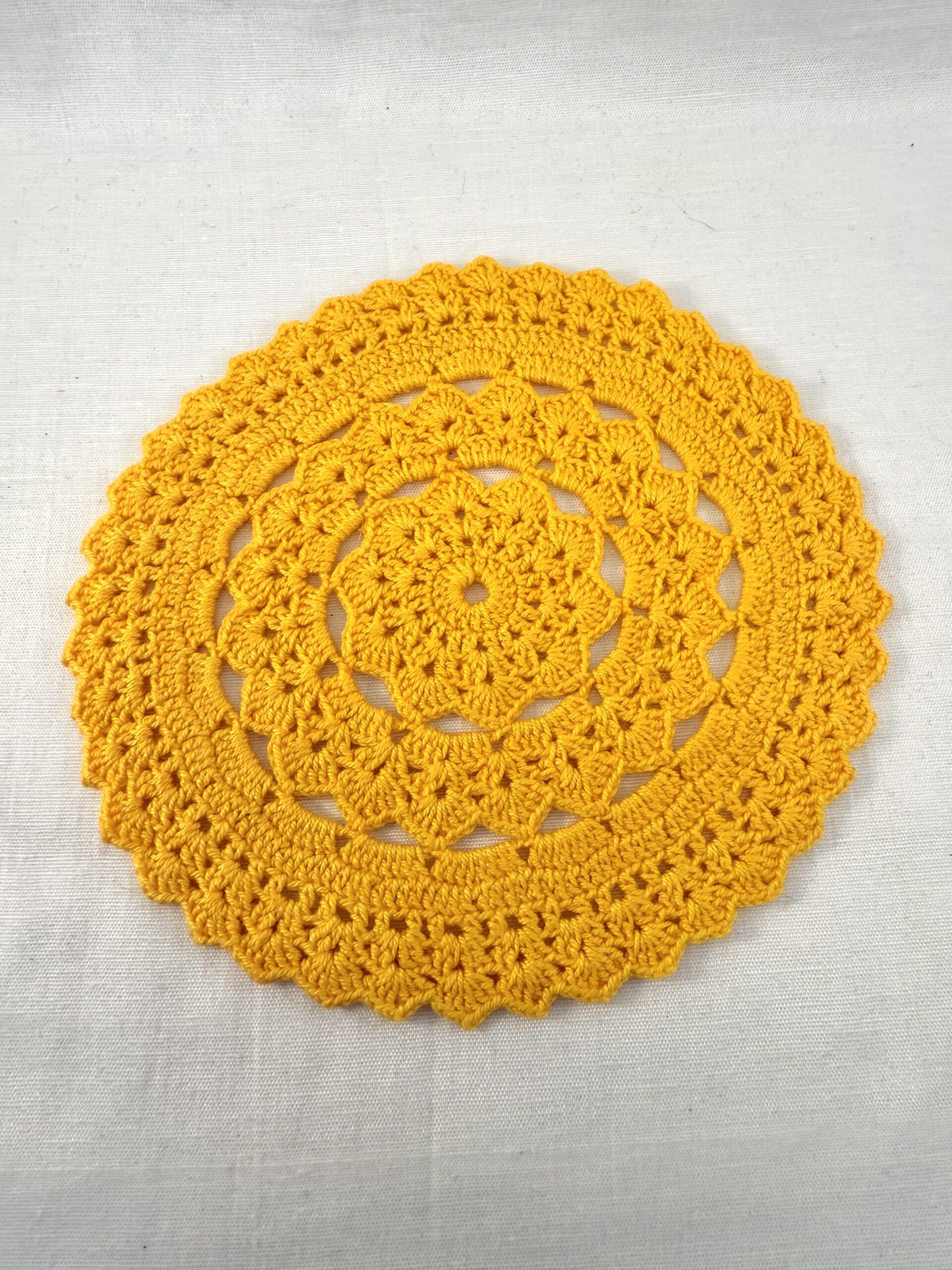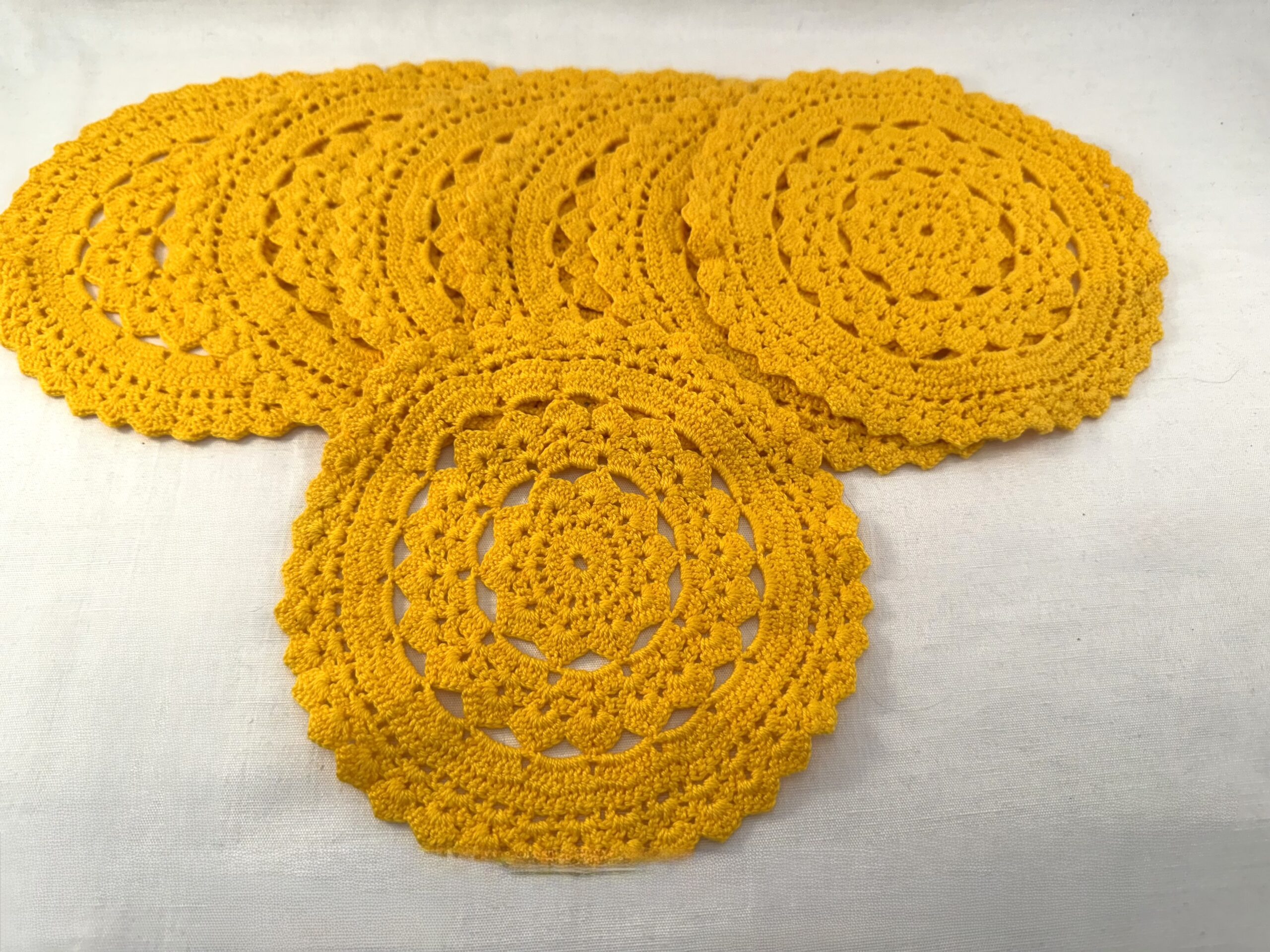 7 stk. smukke, håndhæklede bordskånere i varm gul farve.