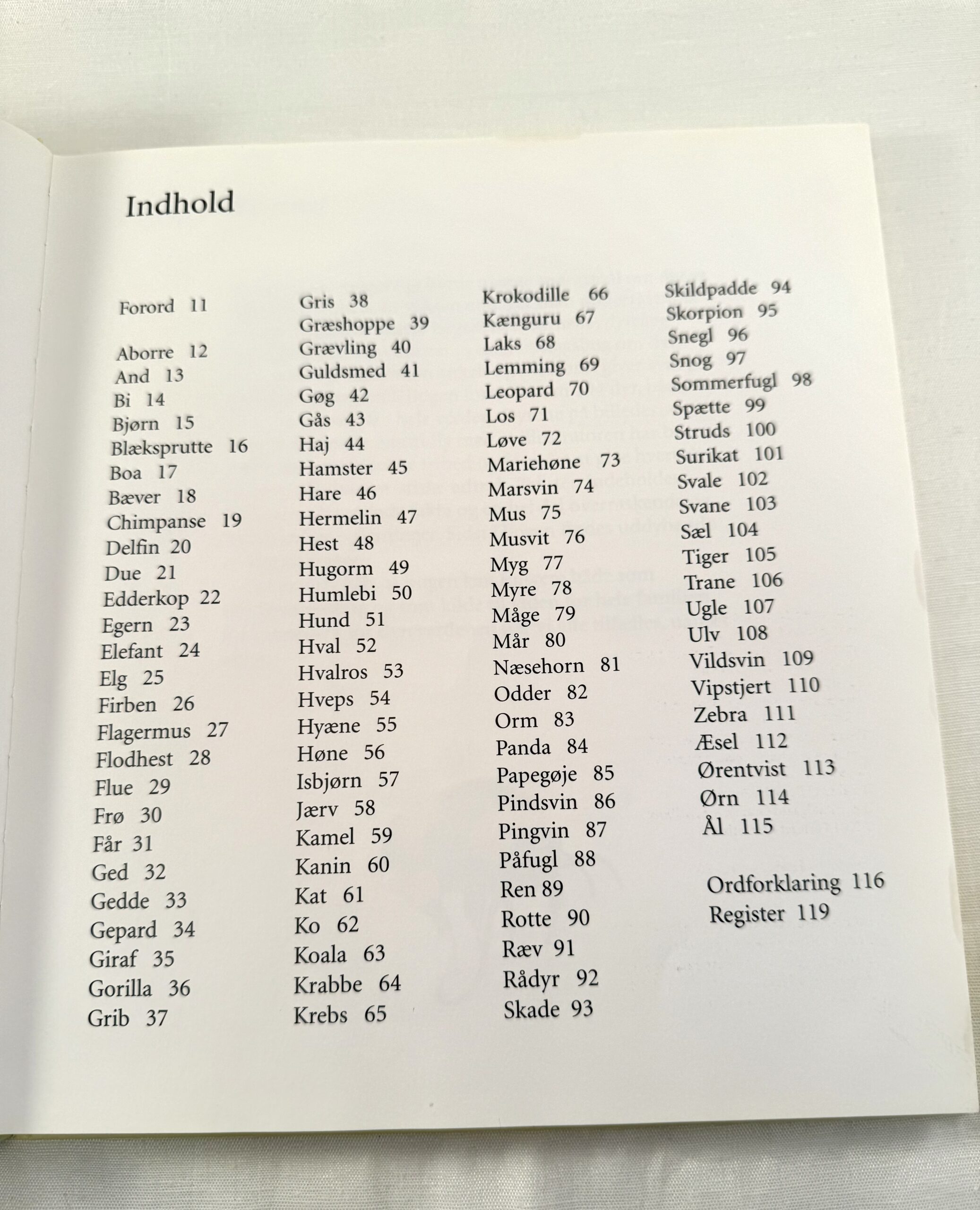 - Sjov og lærerig bog med 104 dyr fra hele verden – fra aborre til ål.