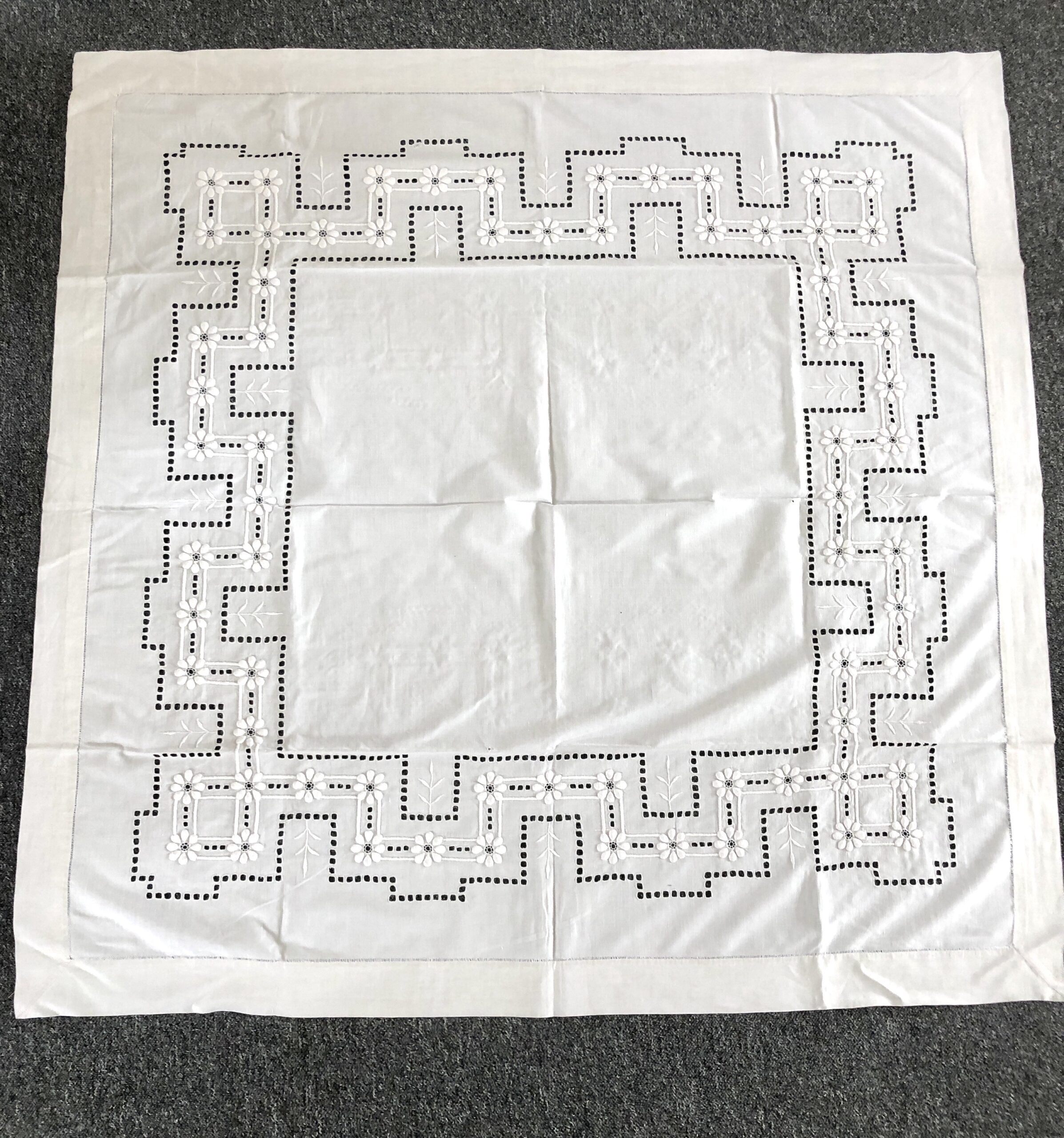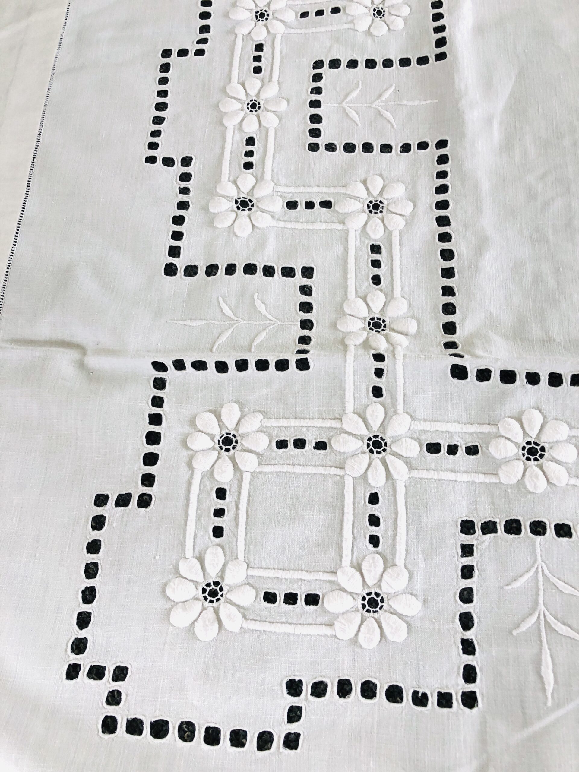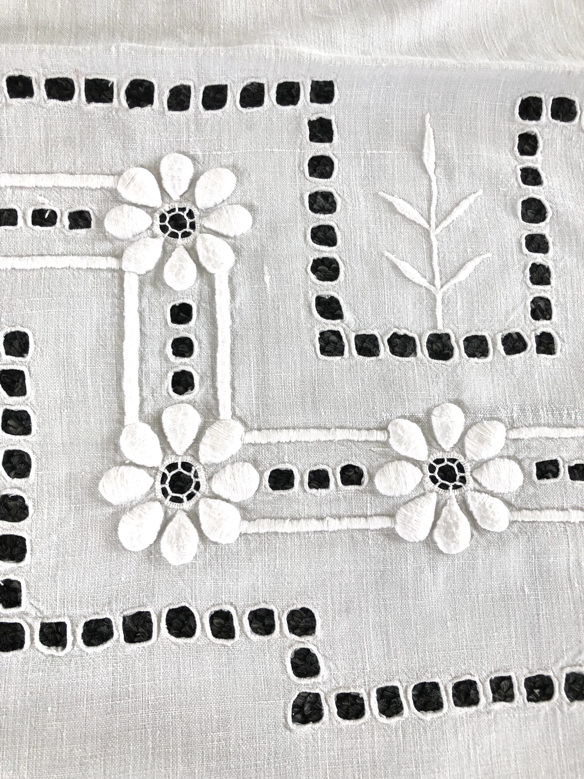 Smuk gammel kraftig hvid dug med broderi / hulbroderi.