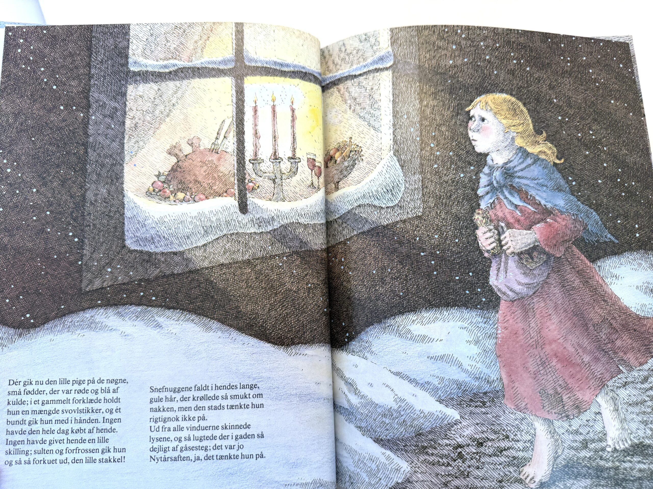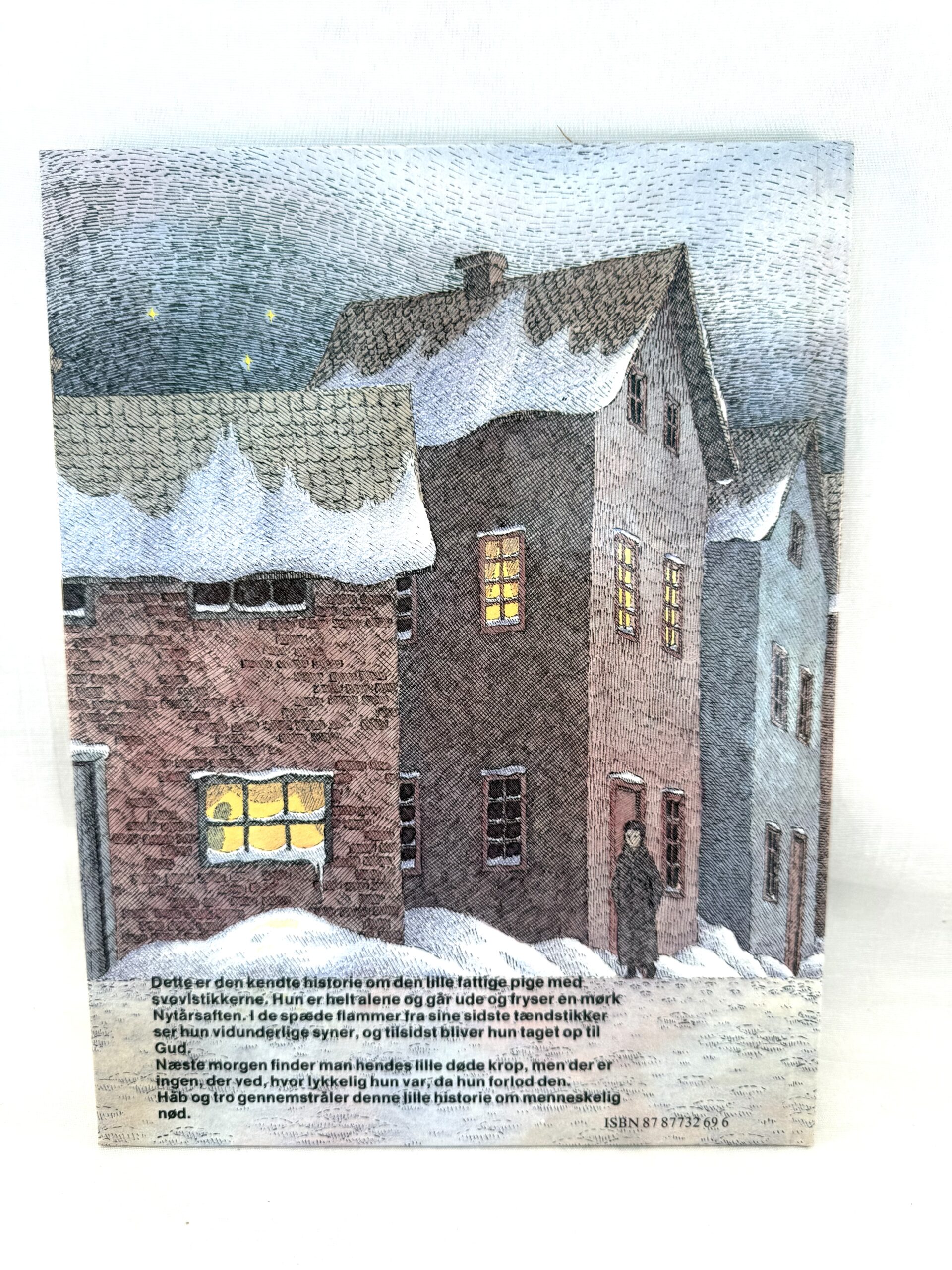- Billedbogsudgave af H.C. Andersens rørende eventyr om den fattige pige, der en kold nytårsaften søger varme og håb i flammerne fra sine sidste svovlstikker.