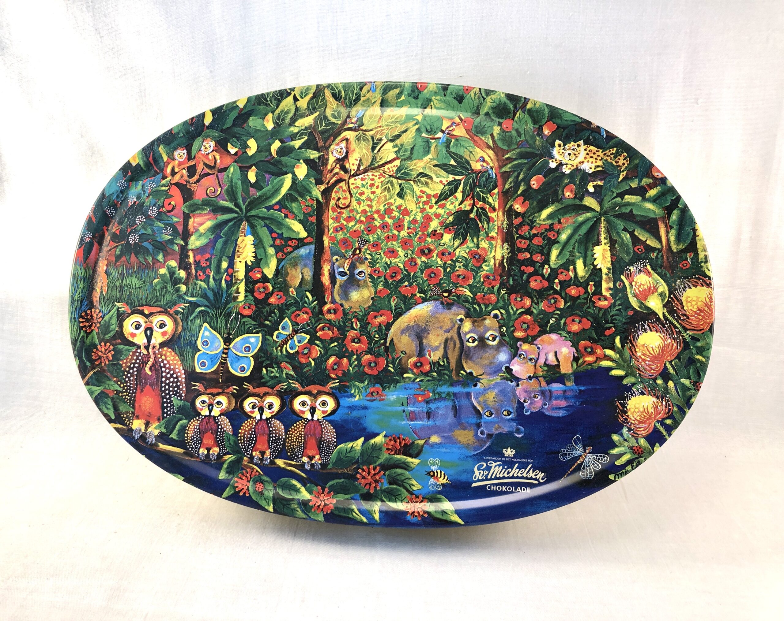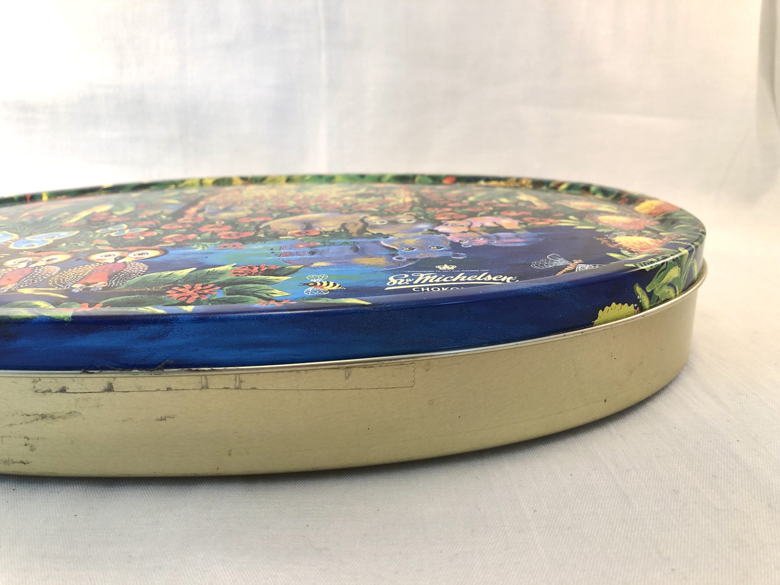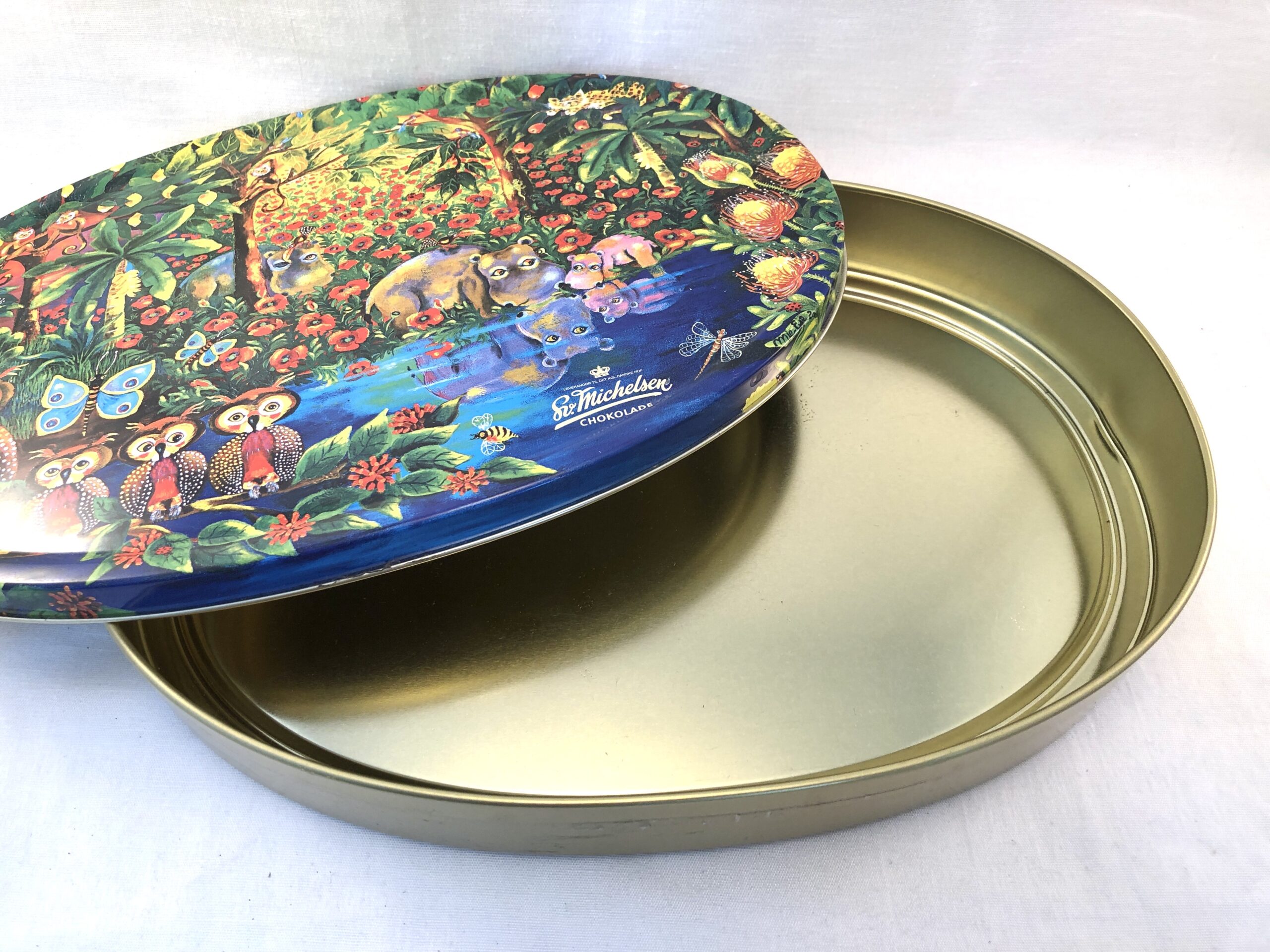 Skøn og dekorativ farverig oval dåse / kagedåse / slikdåse / chokoladedåse.
