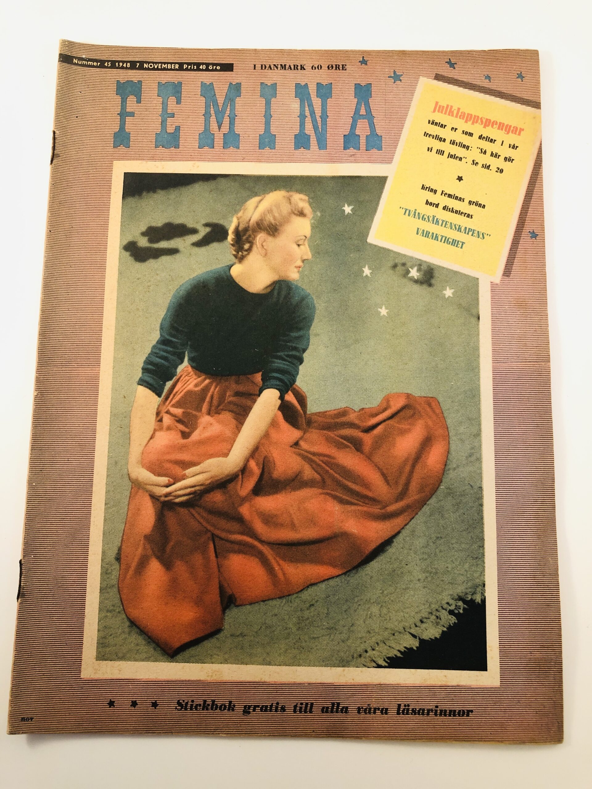 Femina magasin med gamle fine reklamer som vil være rigtig fine bag glas og sort taperamme