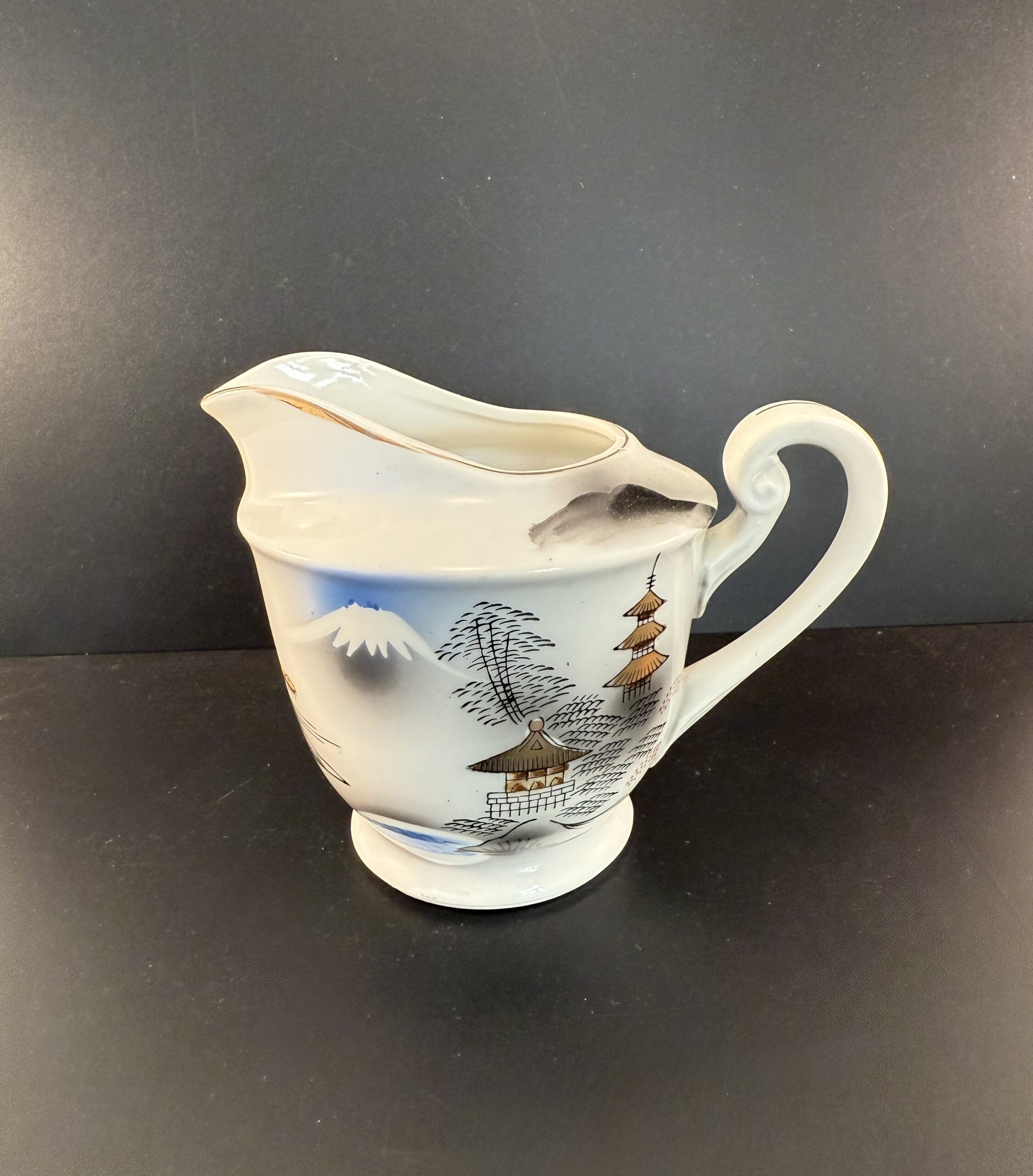 Dekorativ flødekande med håndmalet motiv af japansk bjerglandskab.