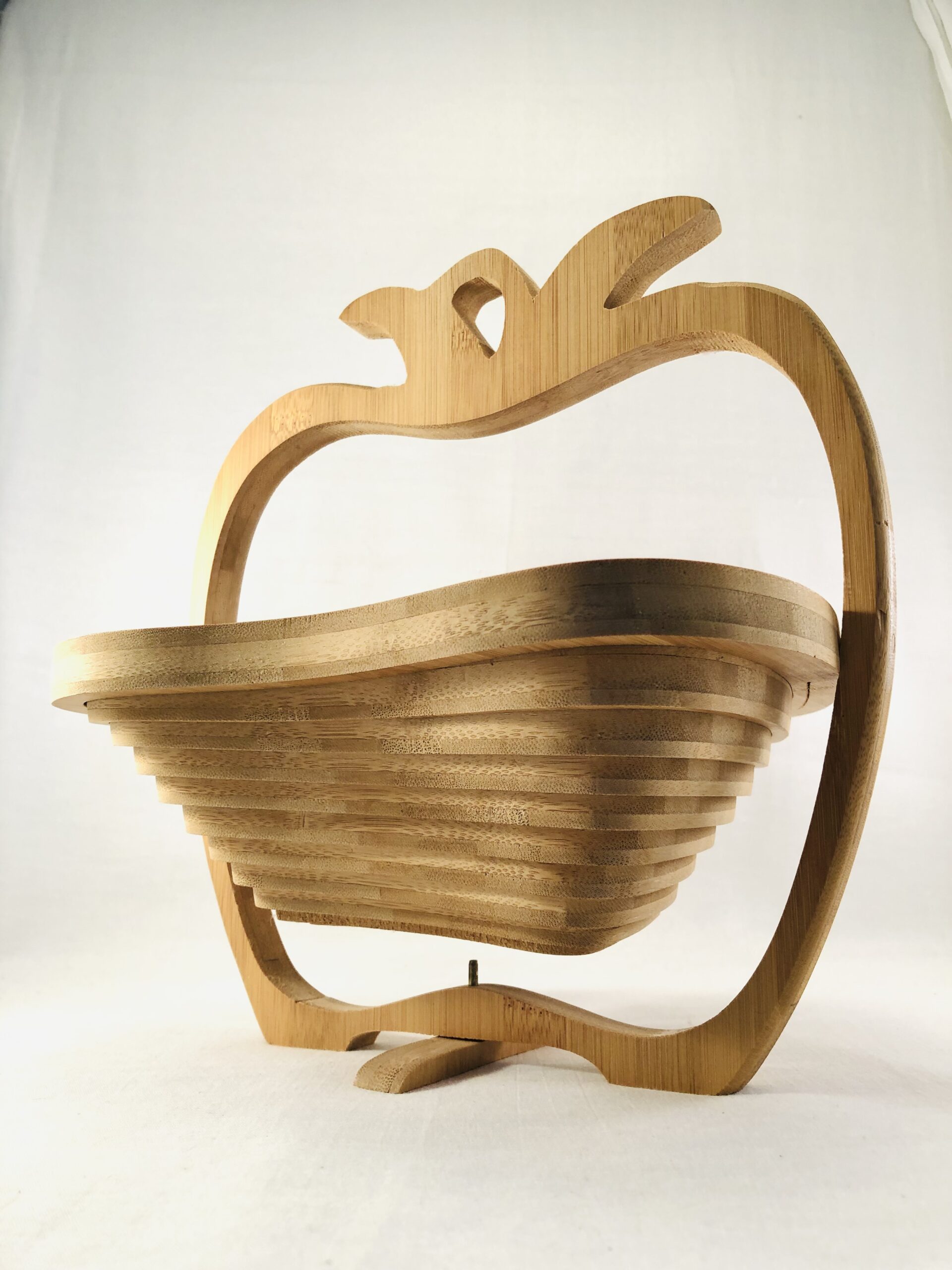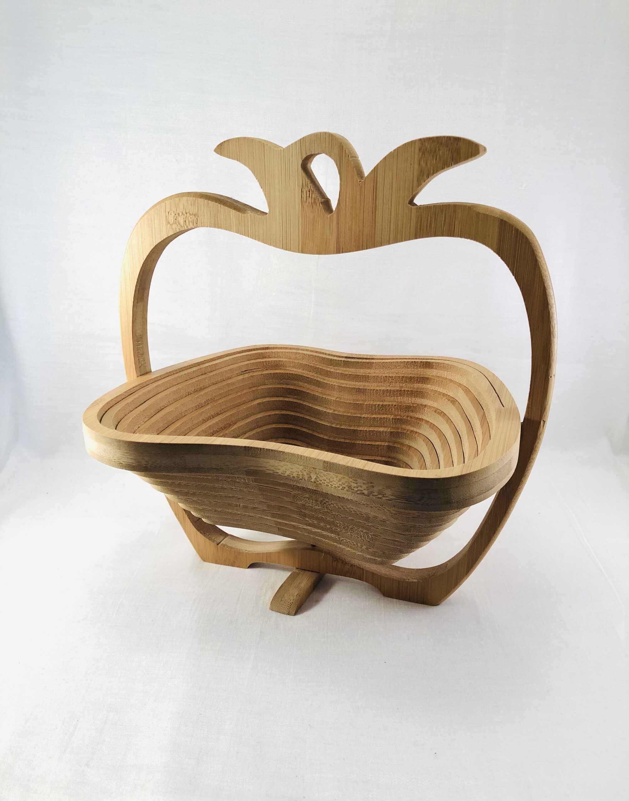 Dekorativ frugtskål / kurv skåret af ét stykke træ.