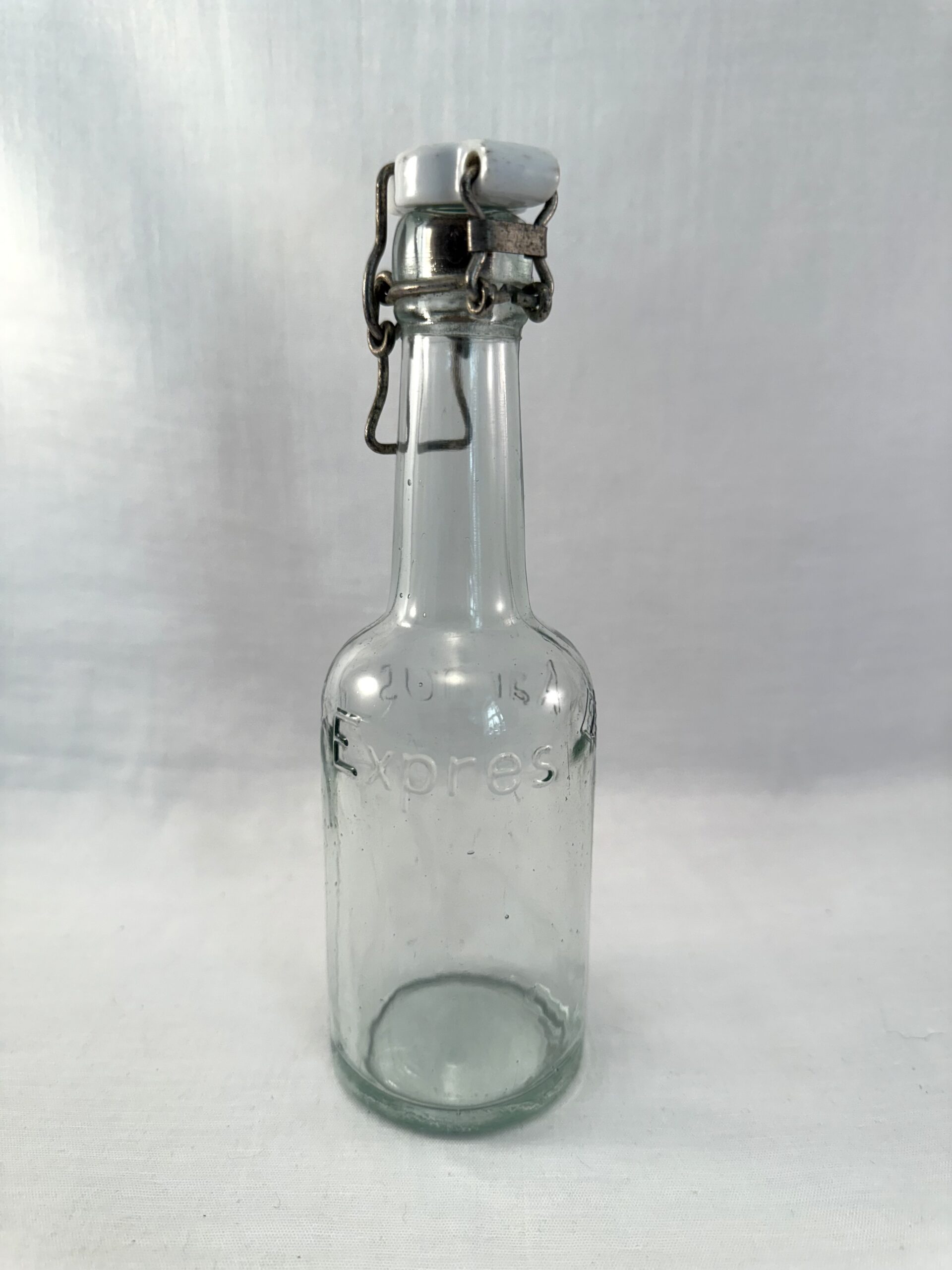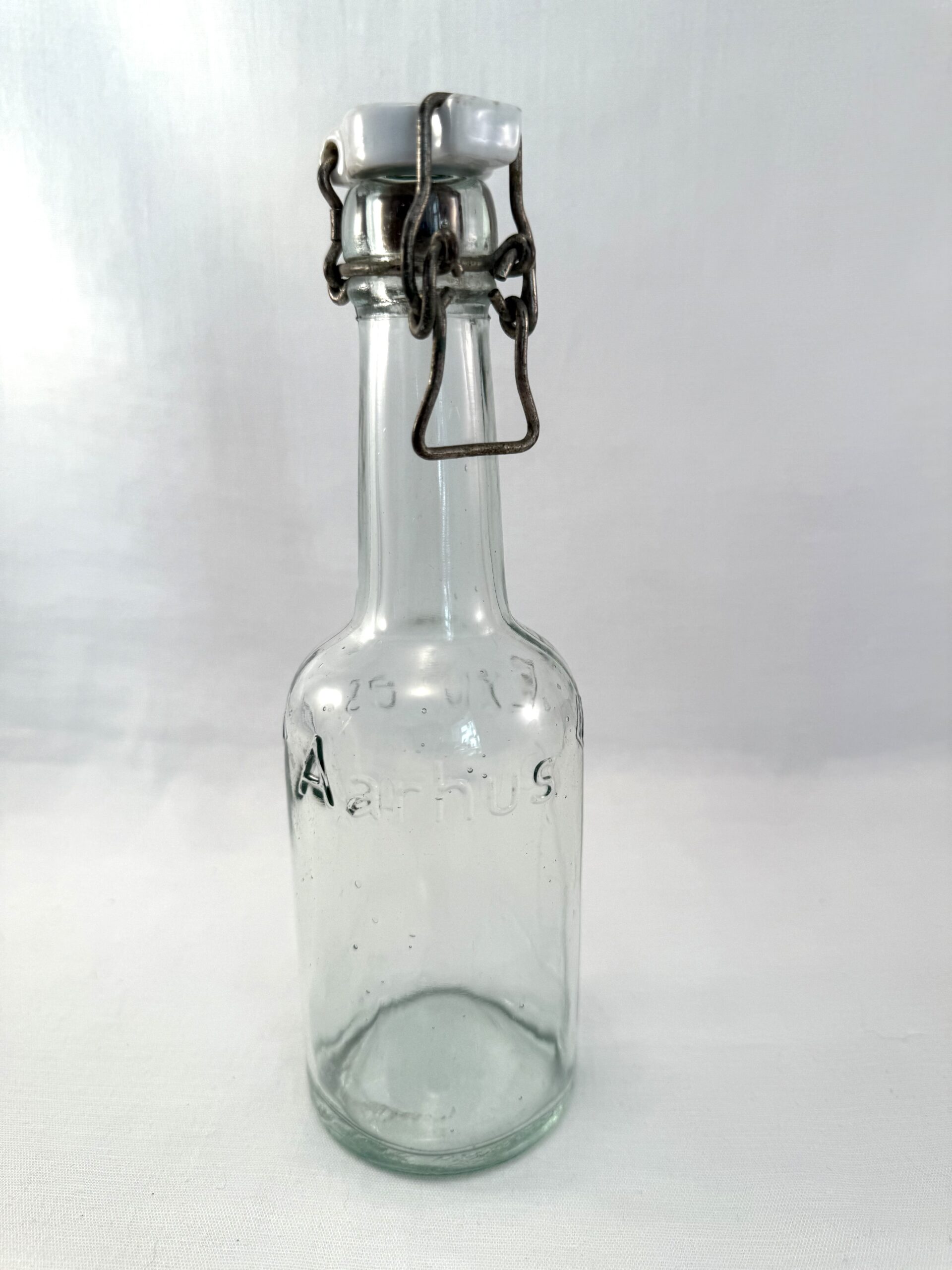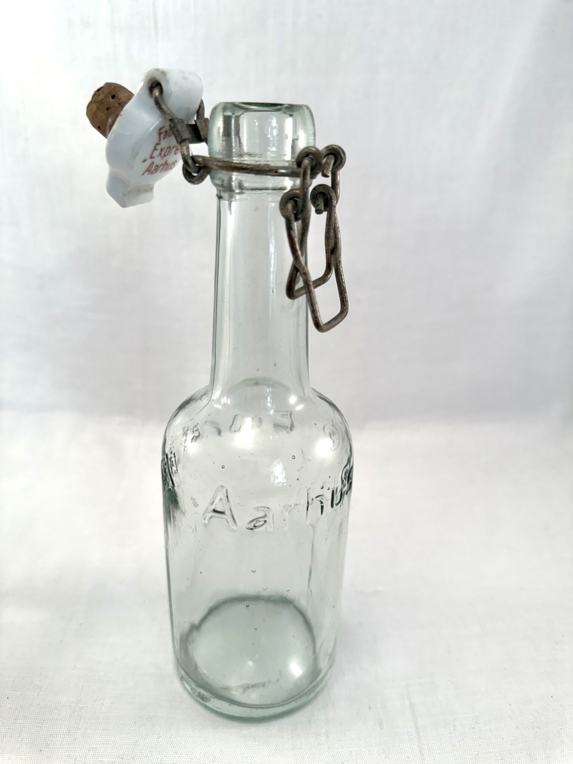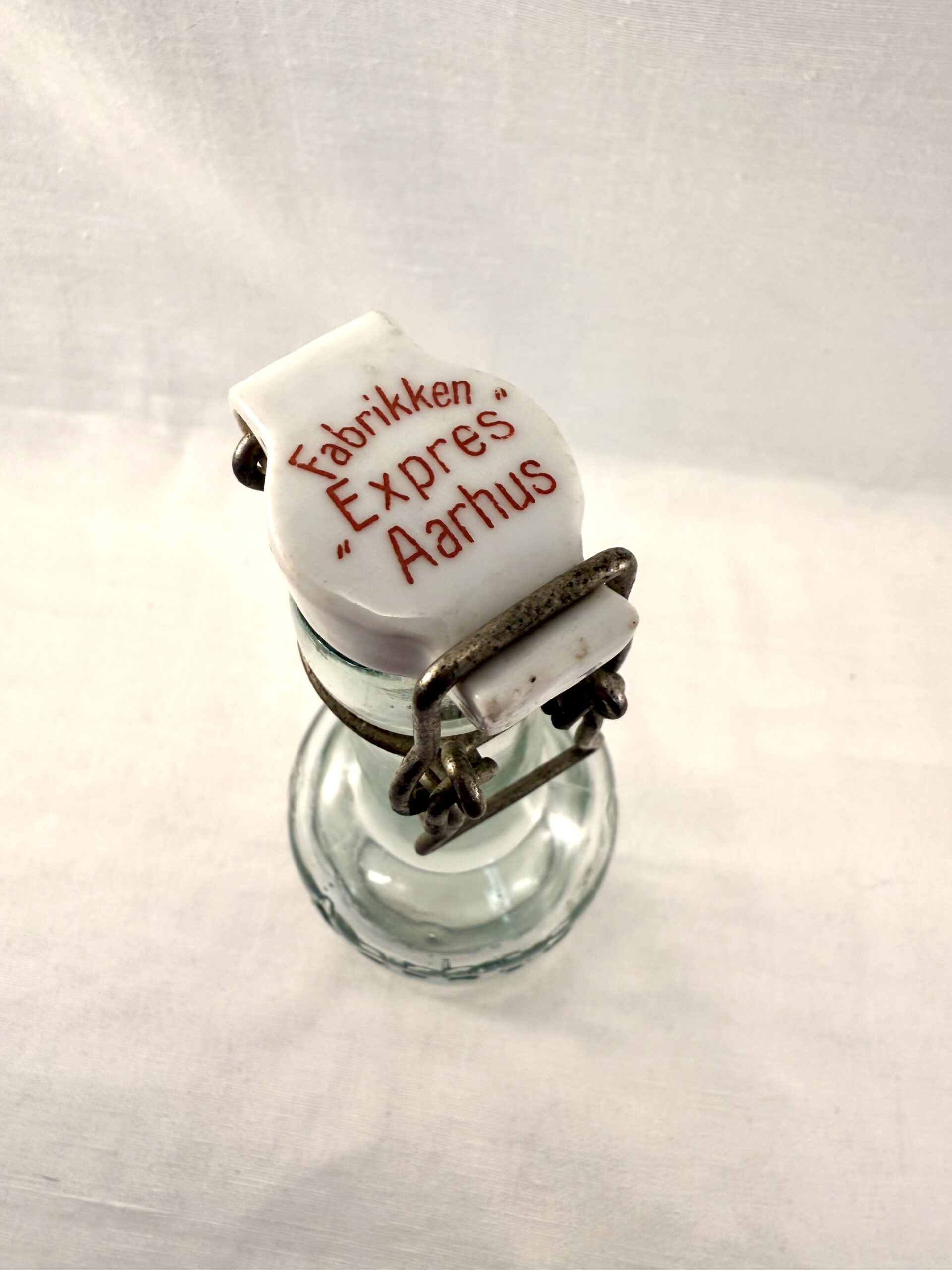 Flasken har indstøbt skrift i glasset og låg med “Fabrikken Expres” Aarhus”