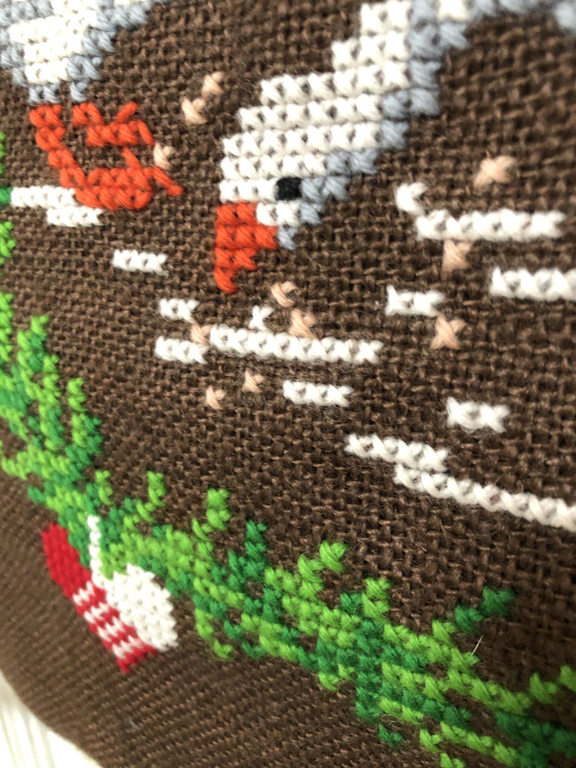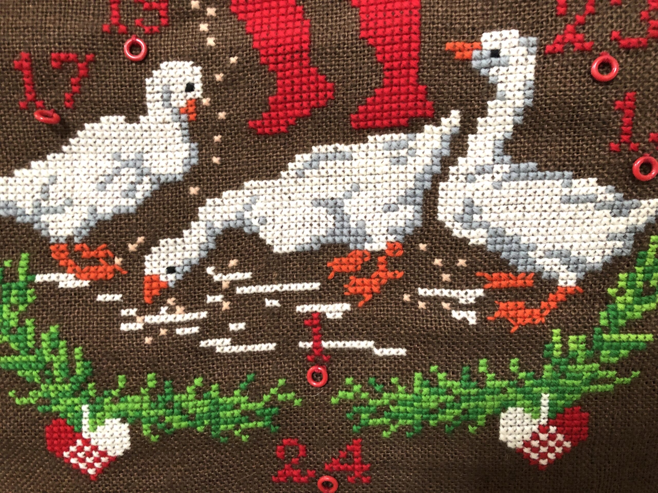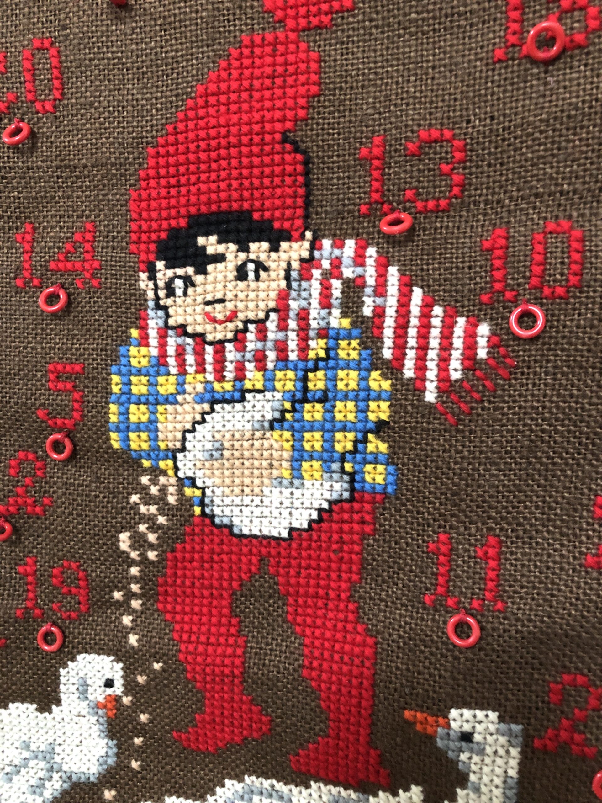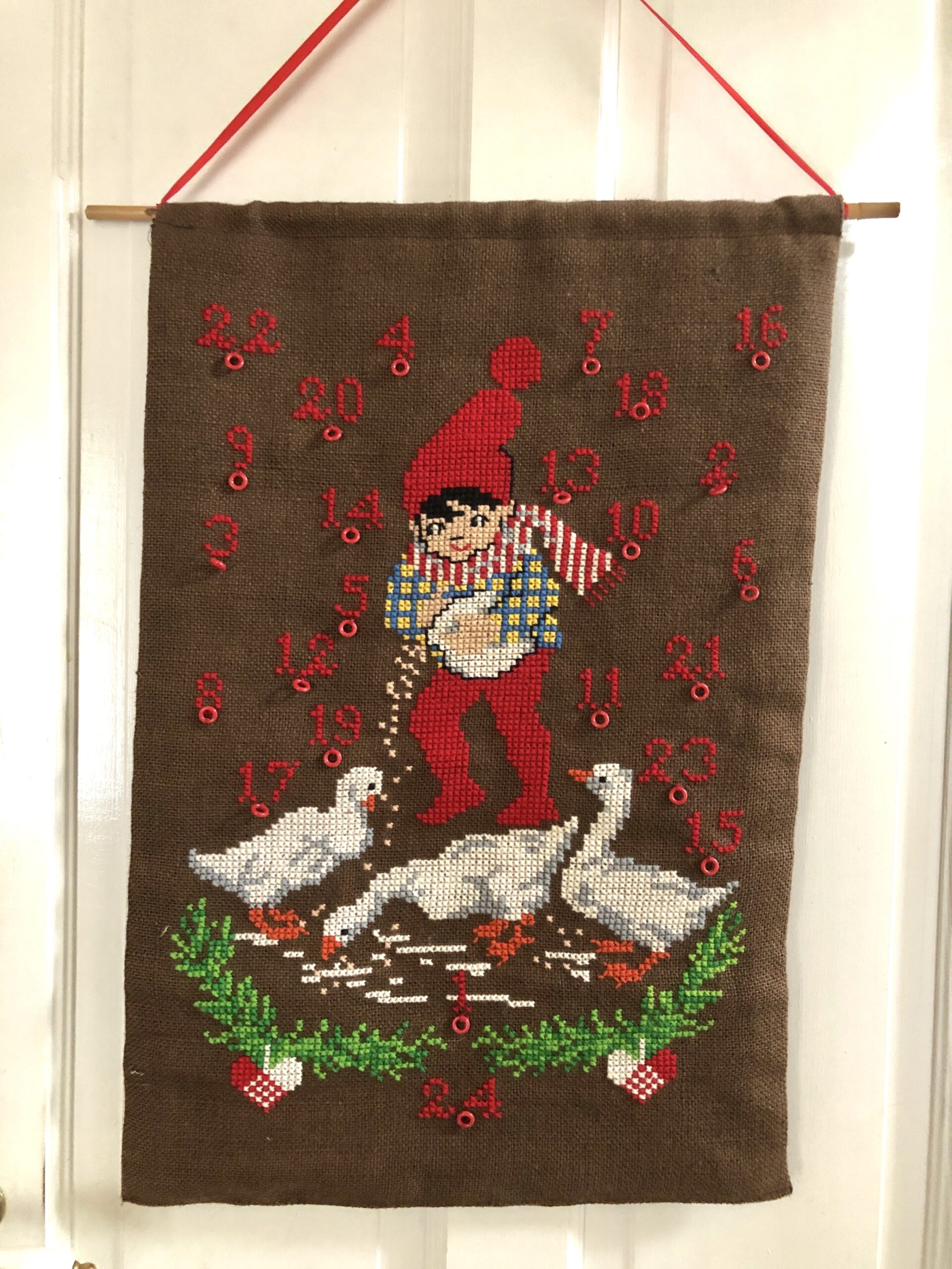 - Håndbroderet retro julekalender / pakkekalender – med nisse og gæs.
