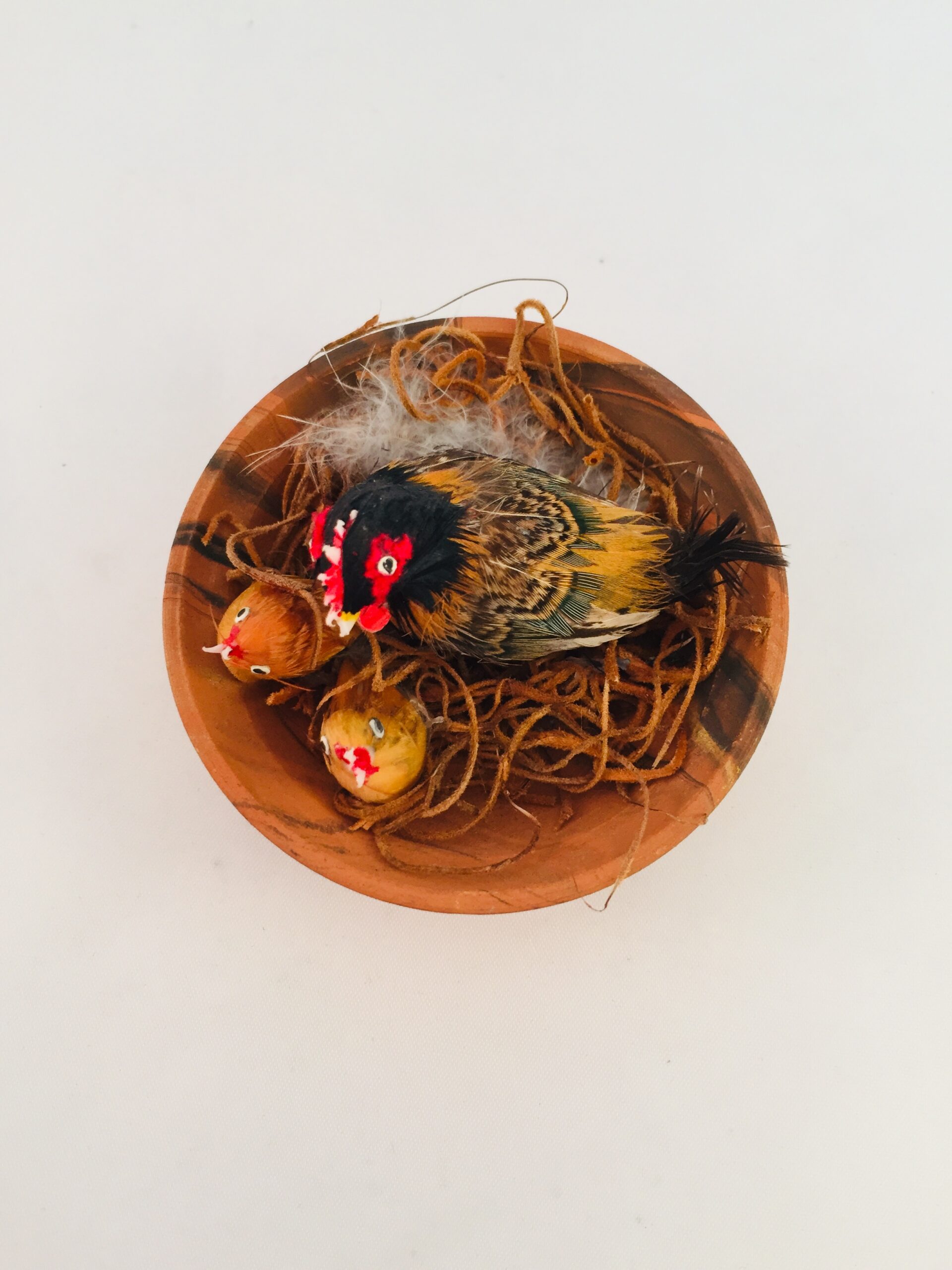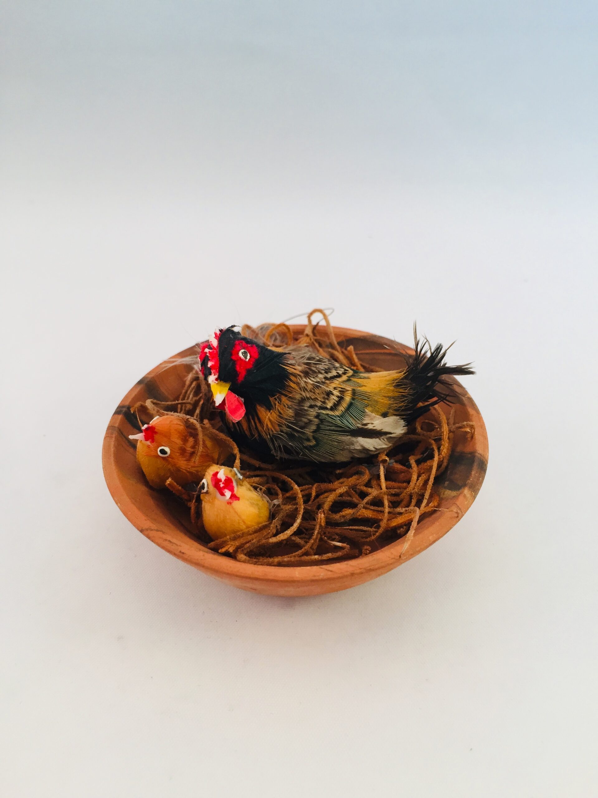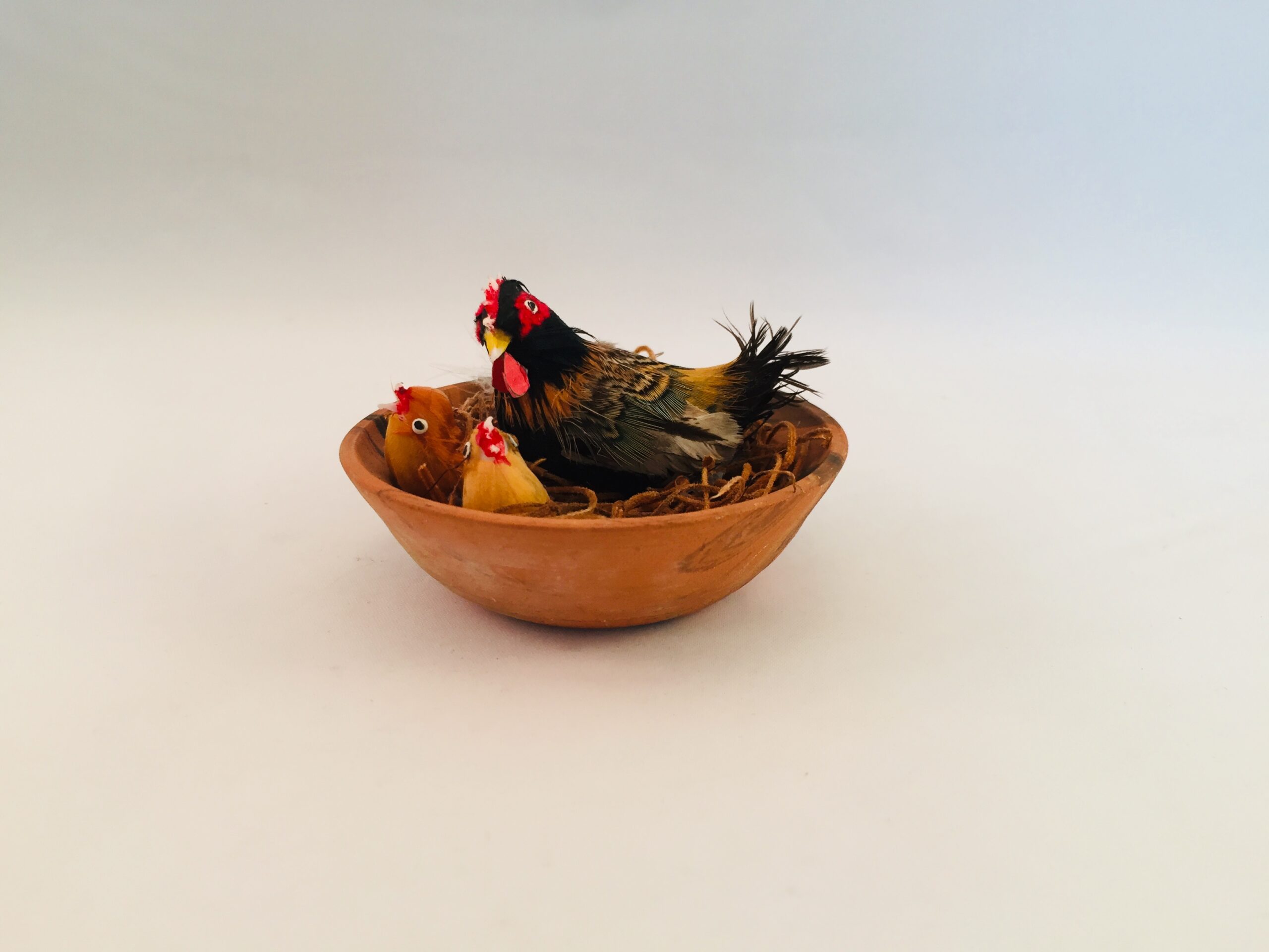 Hønemor med sine 2 kyllinger i rede i lerskål.