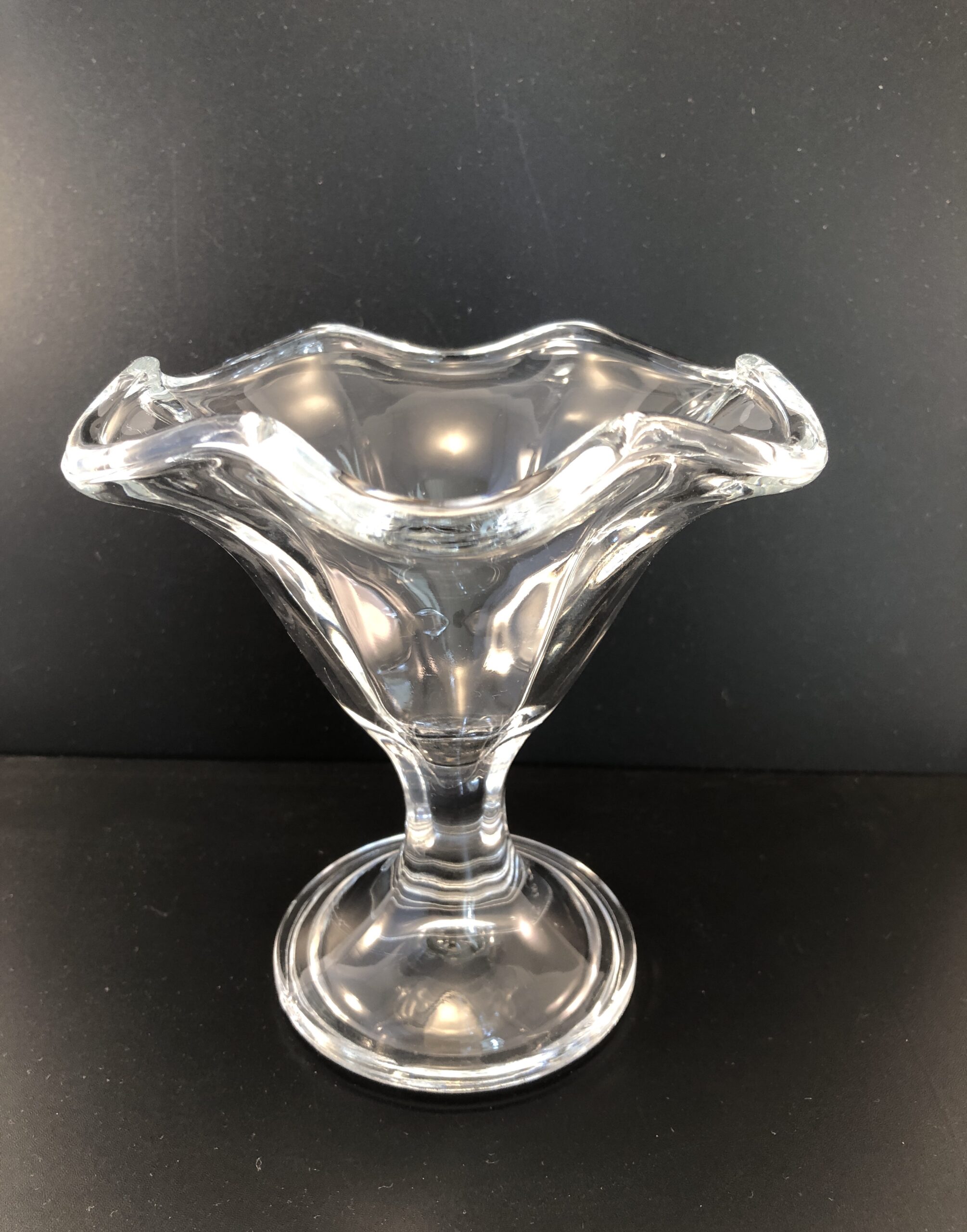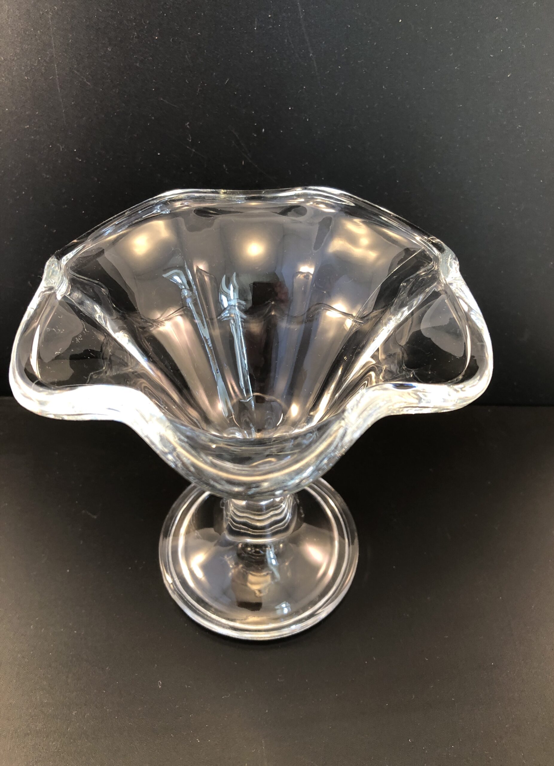 Dessertglas / dessertskål / isglas med bølget kant og stilkfod.