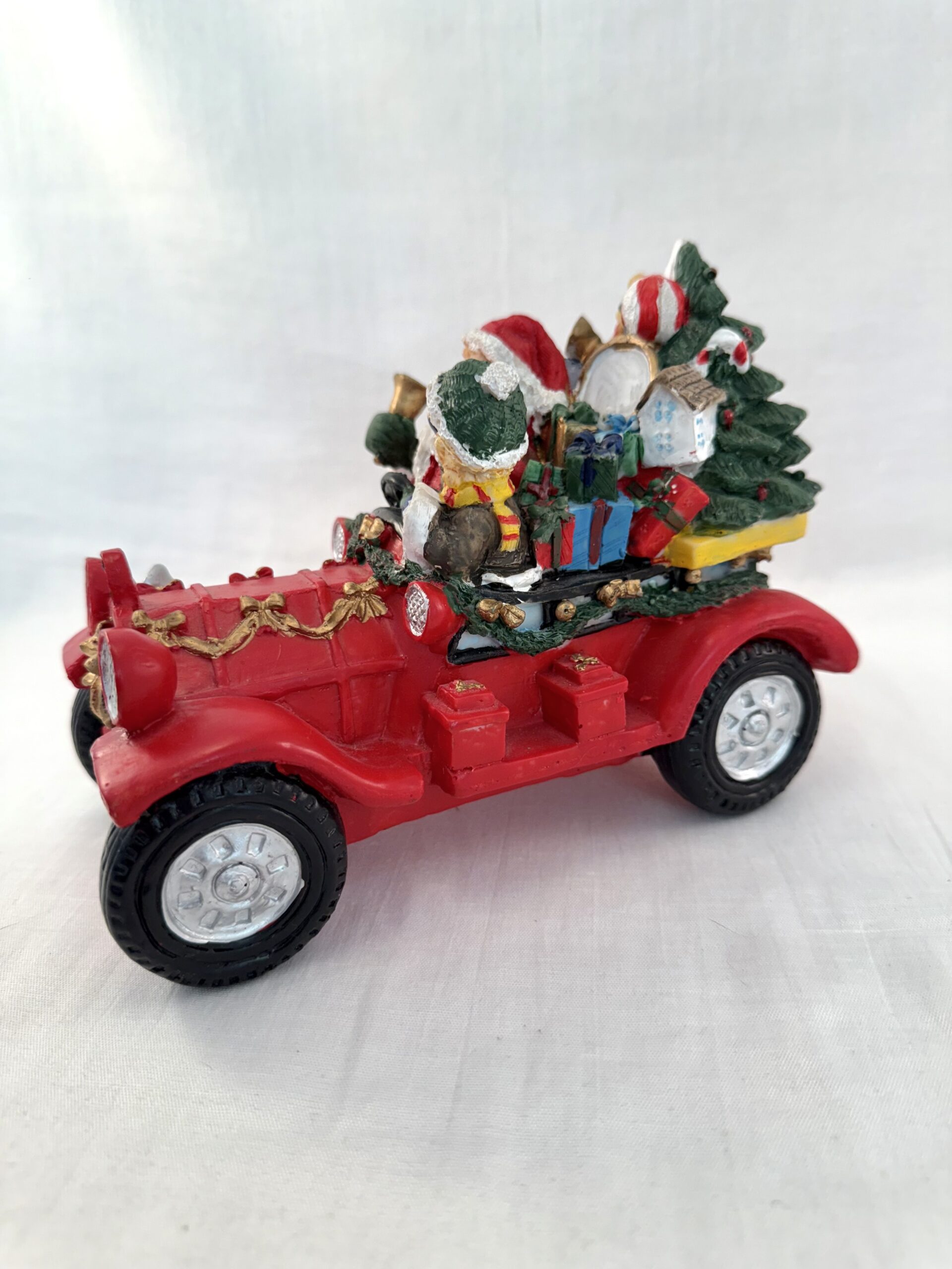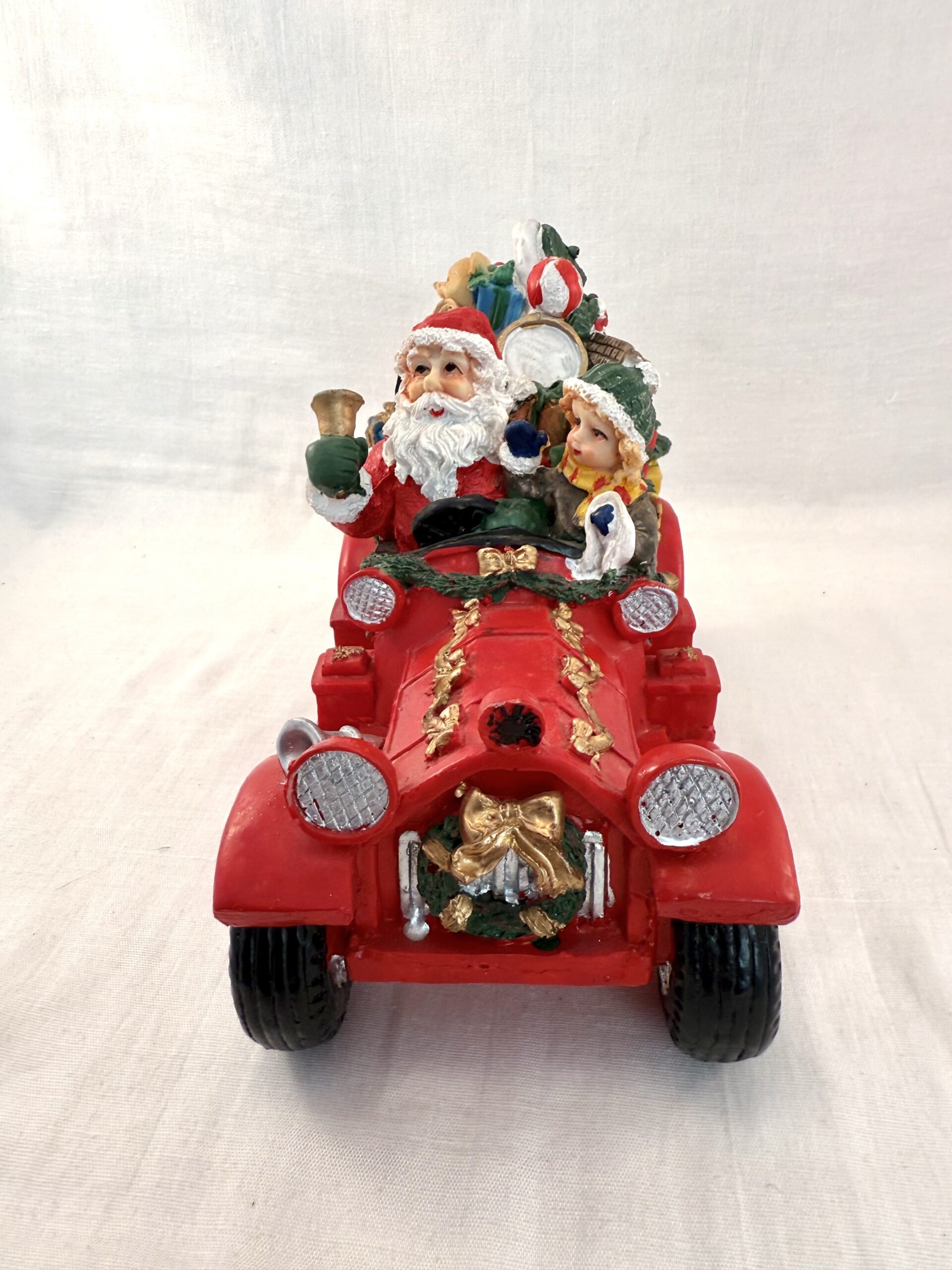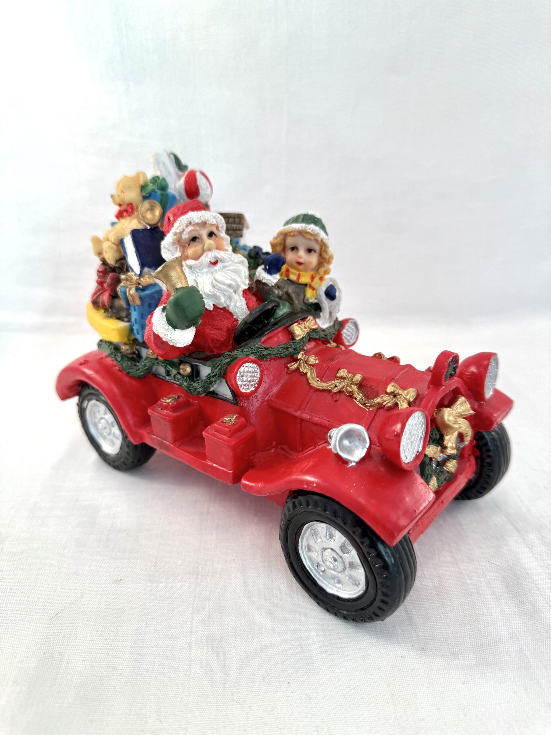 Fin dekorationsfigur med julemanden, en lille pige og masser af gaver i en rød bil.