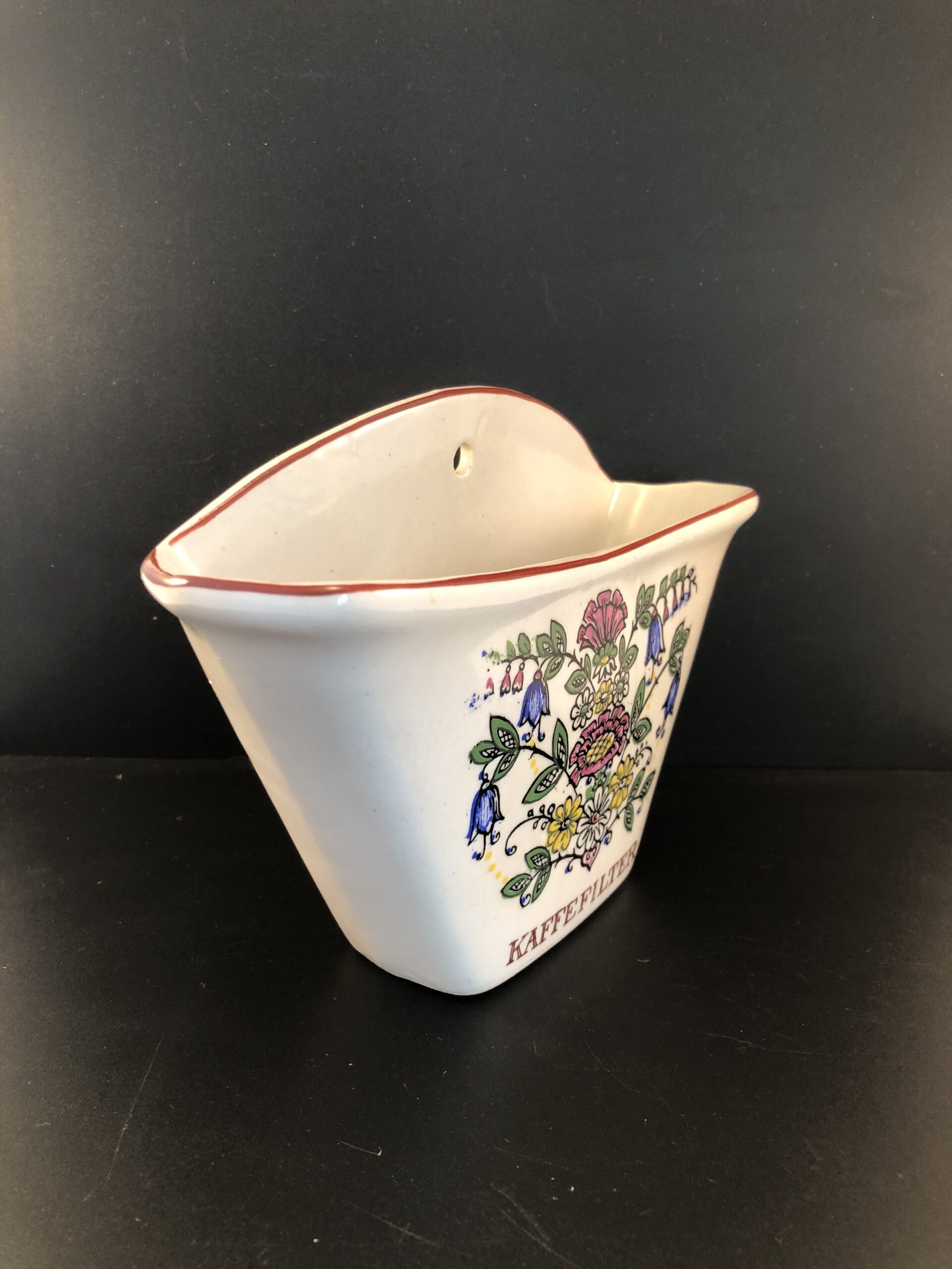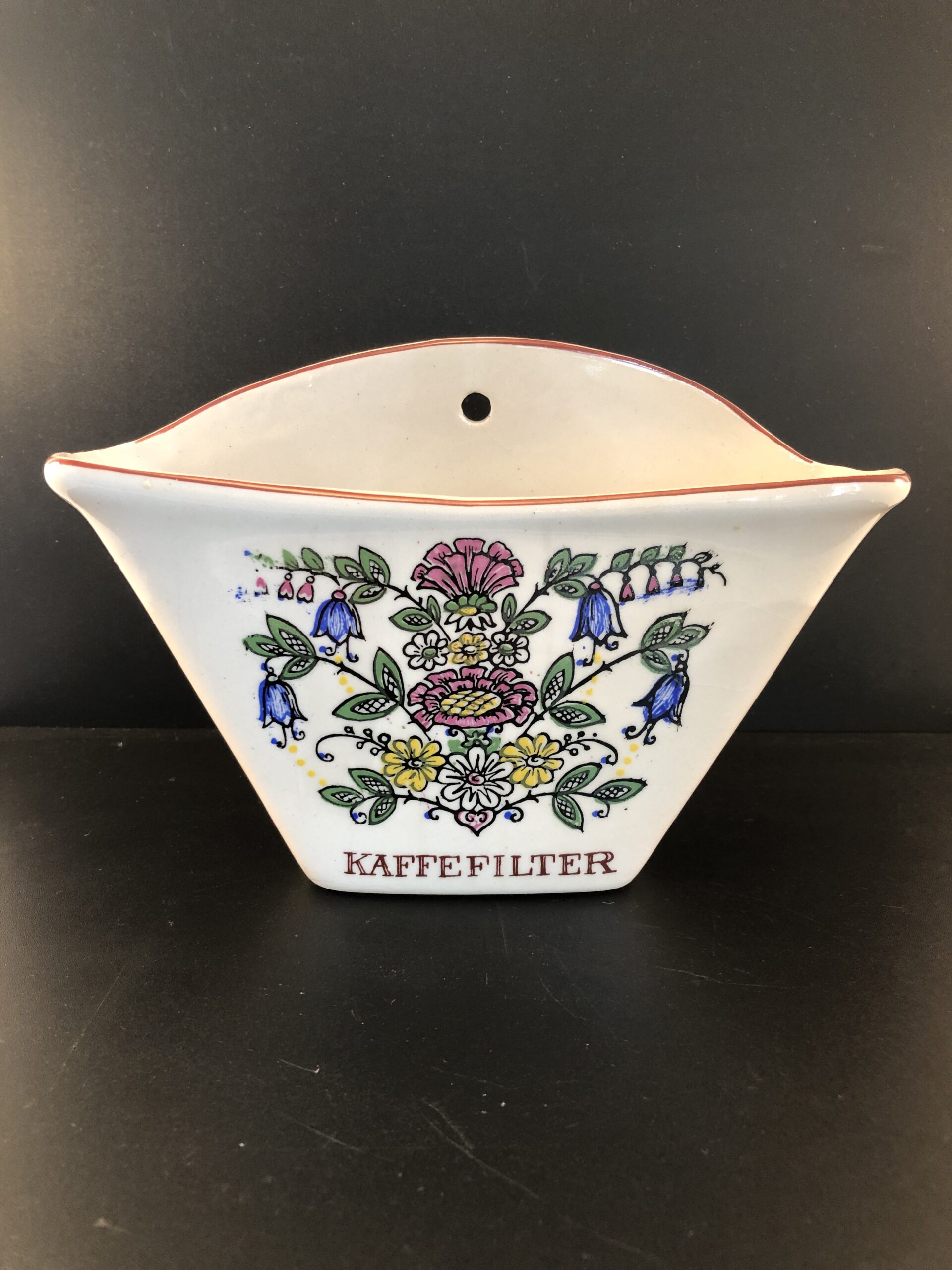 Kaffefilterholder med dekorativt mønster.
