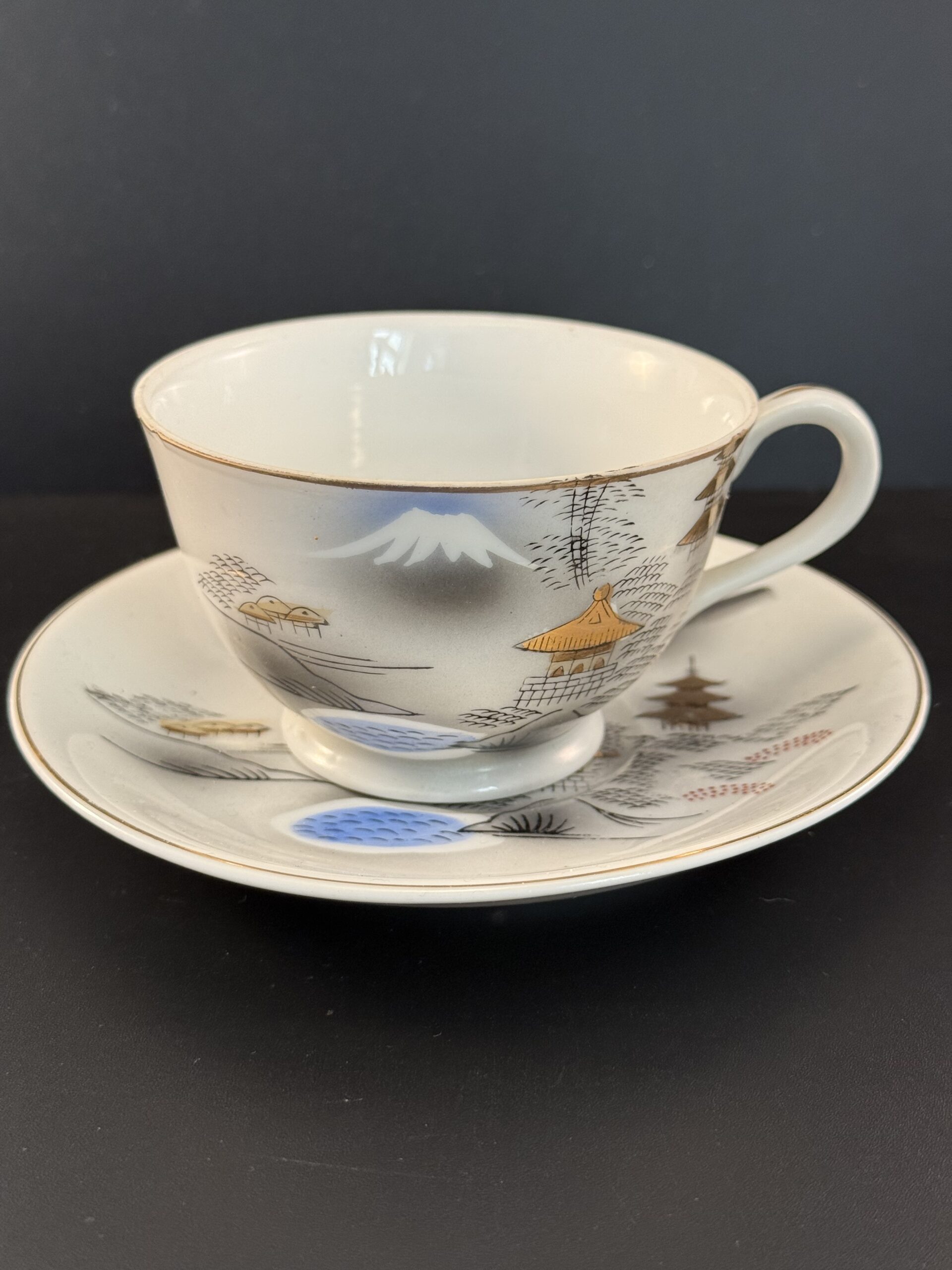 - Dekorativ kaffesæt / tesæt med håndmalet motiv af japansk bjerglandskab.