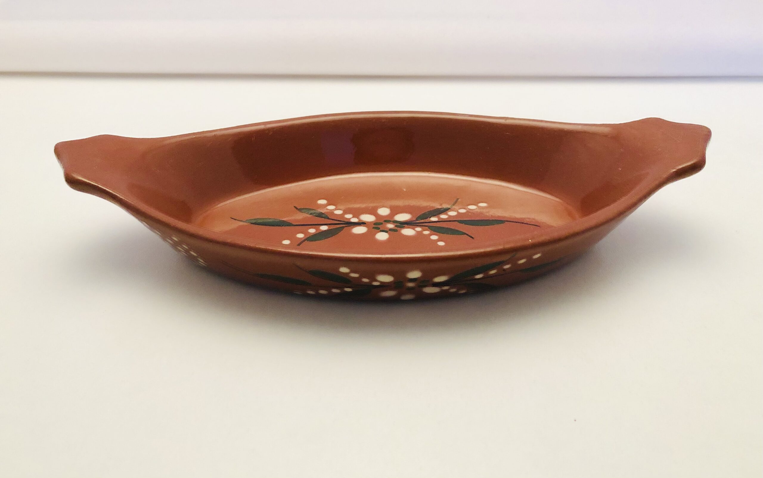 Fint ovalt glaseret lerskål med flot mønster.