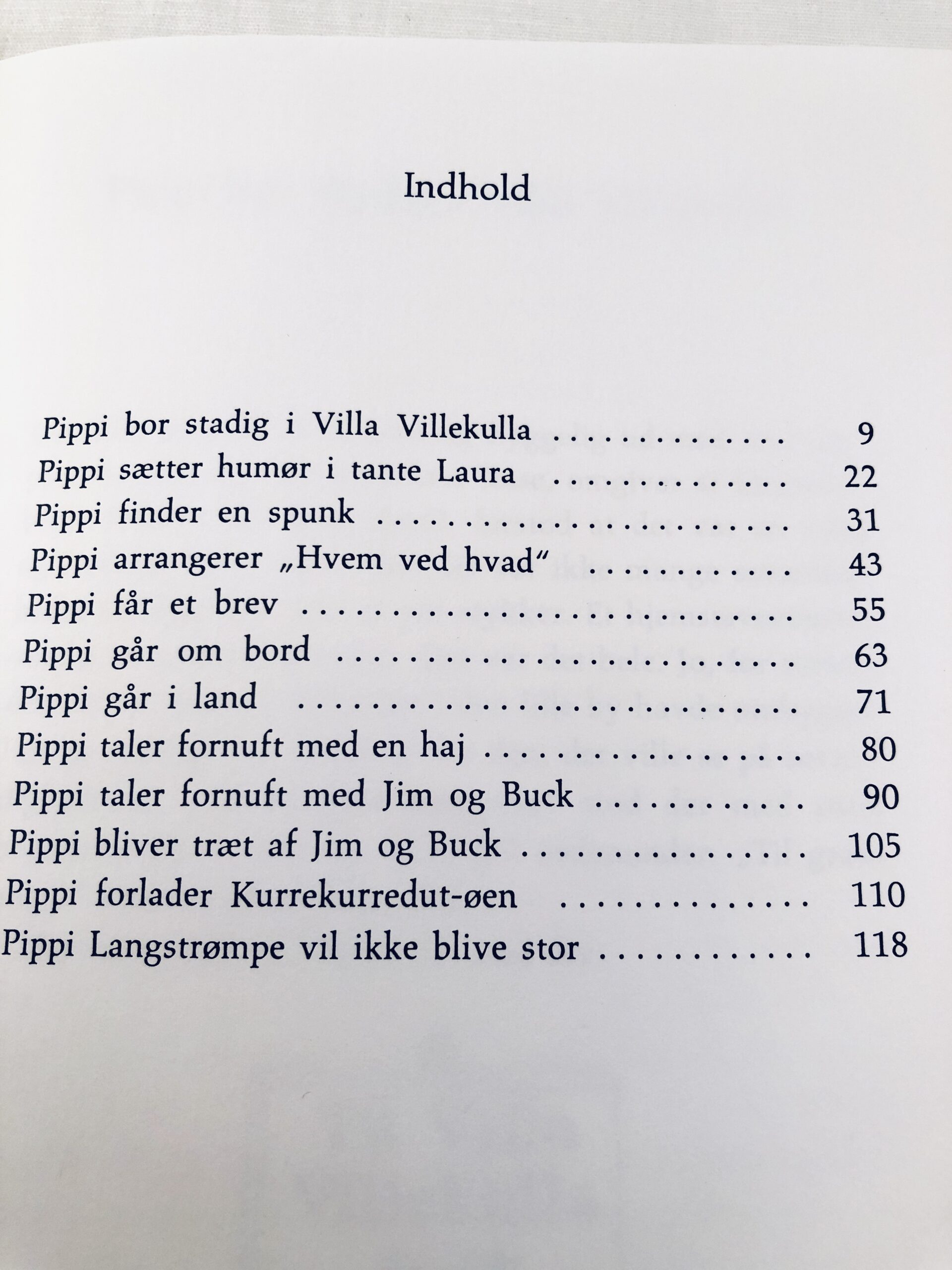 - Bogen indeholder 13 kapitler, hvor Pippi blandt andet finder en spunk, taler fornuft med en haj og beslutter, at hun aldrig vil blive voksen.