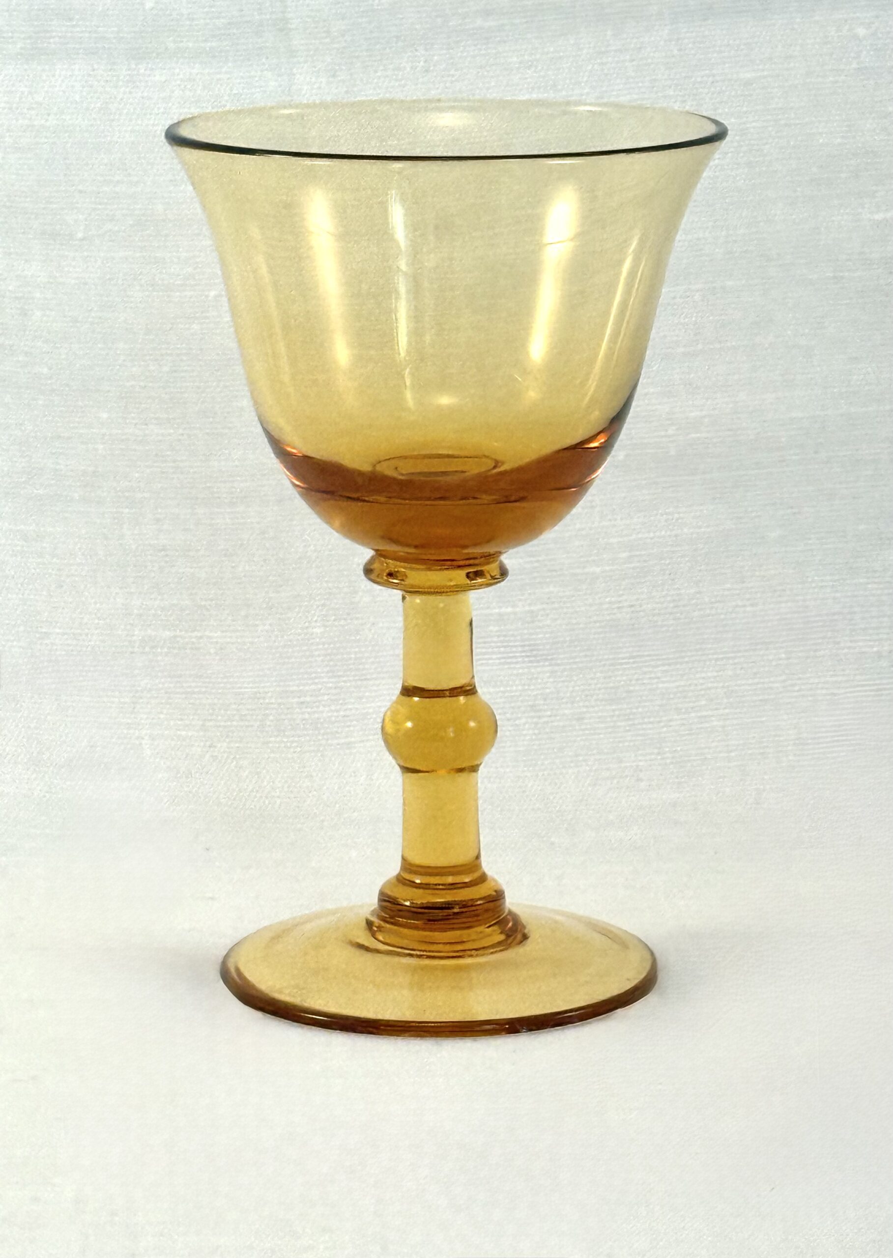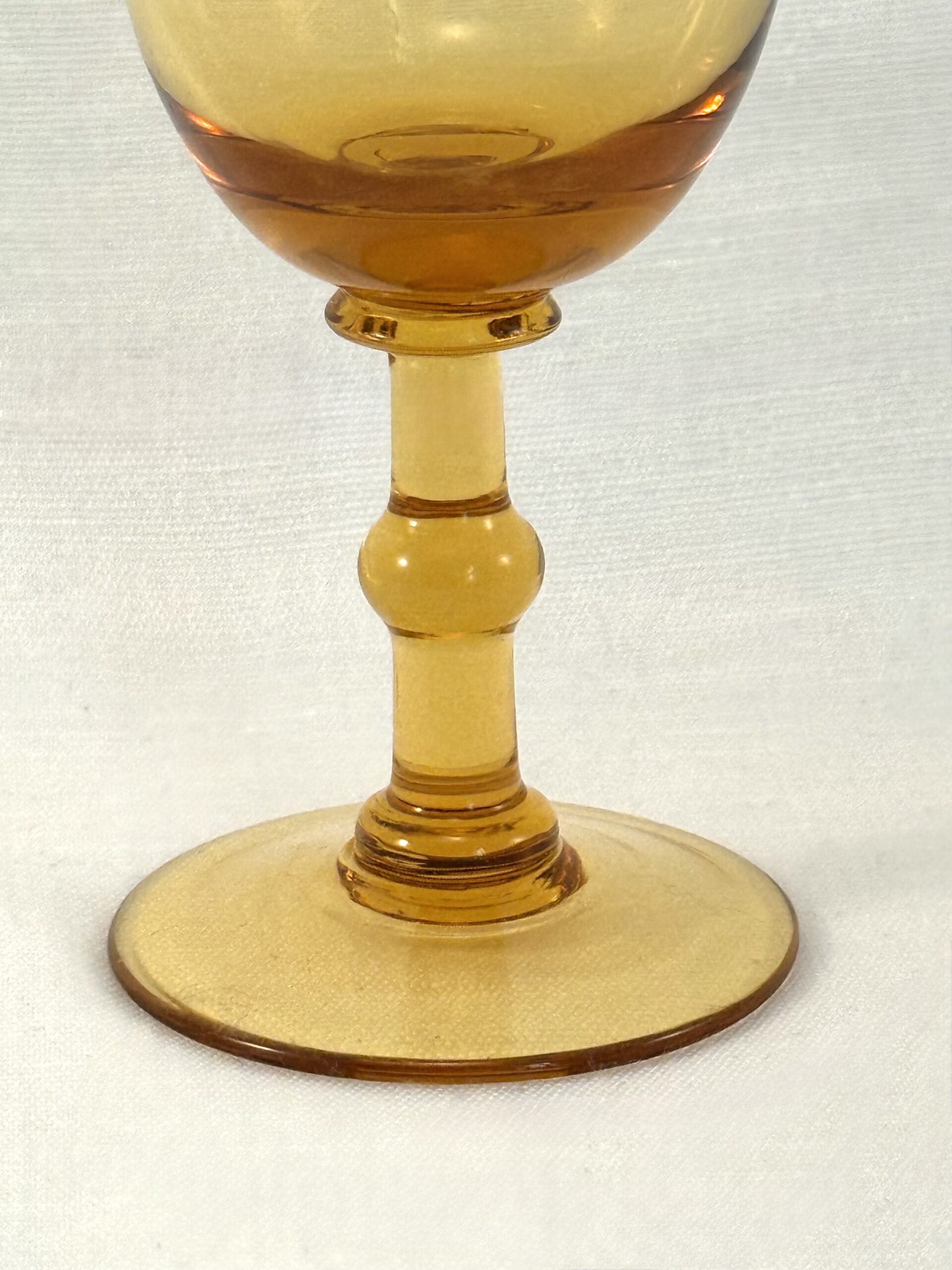 Flotlille likørglas i varm ravgul tone med dekorativ balusterstilk.