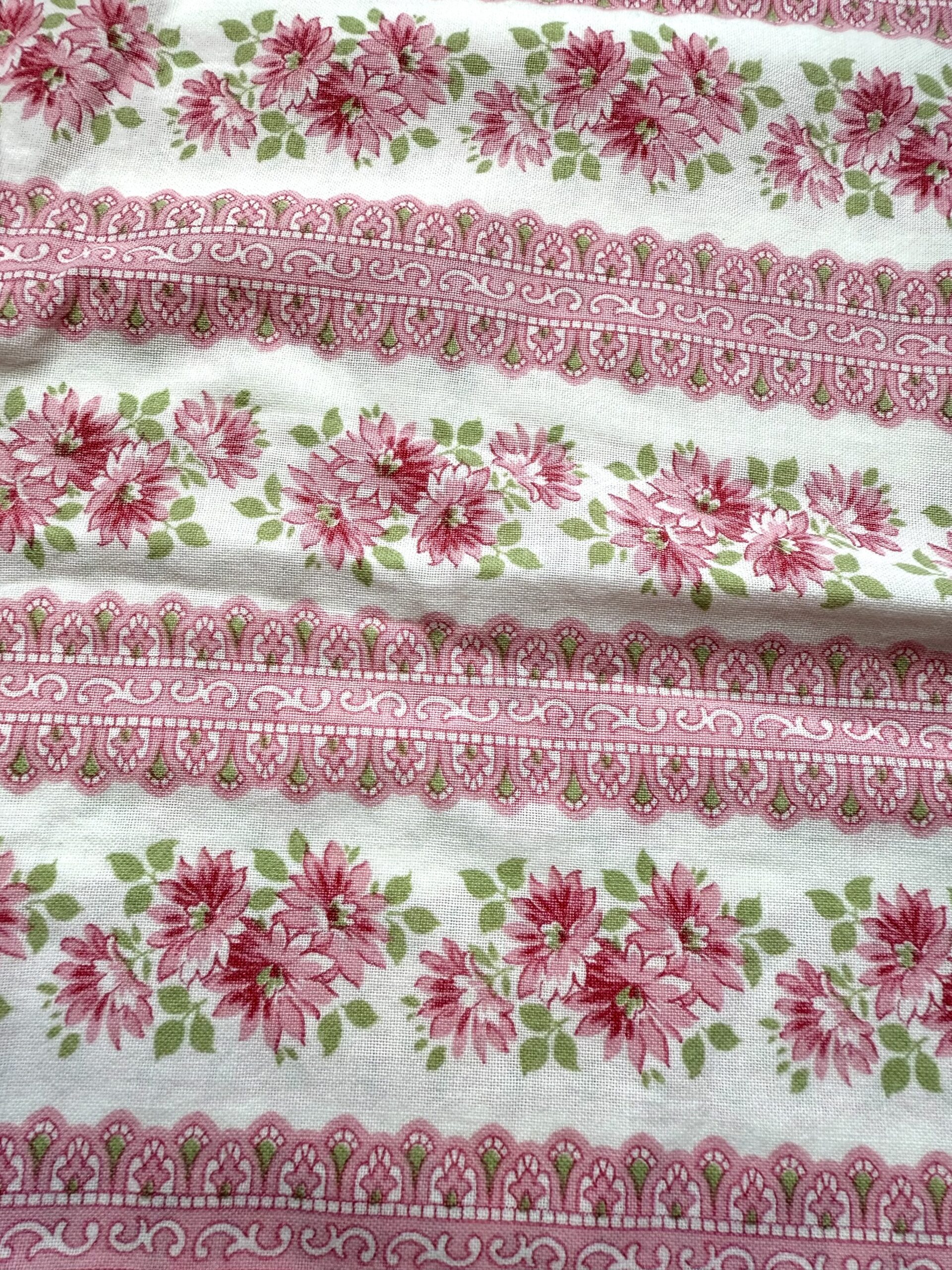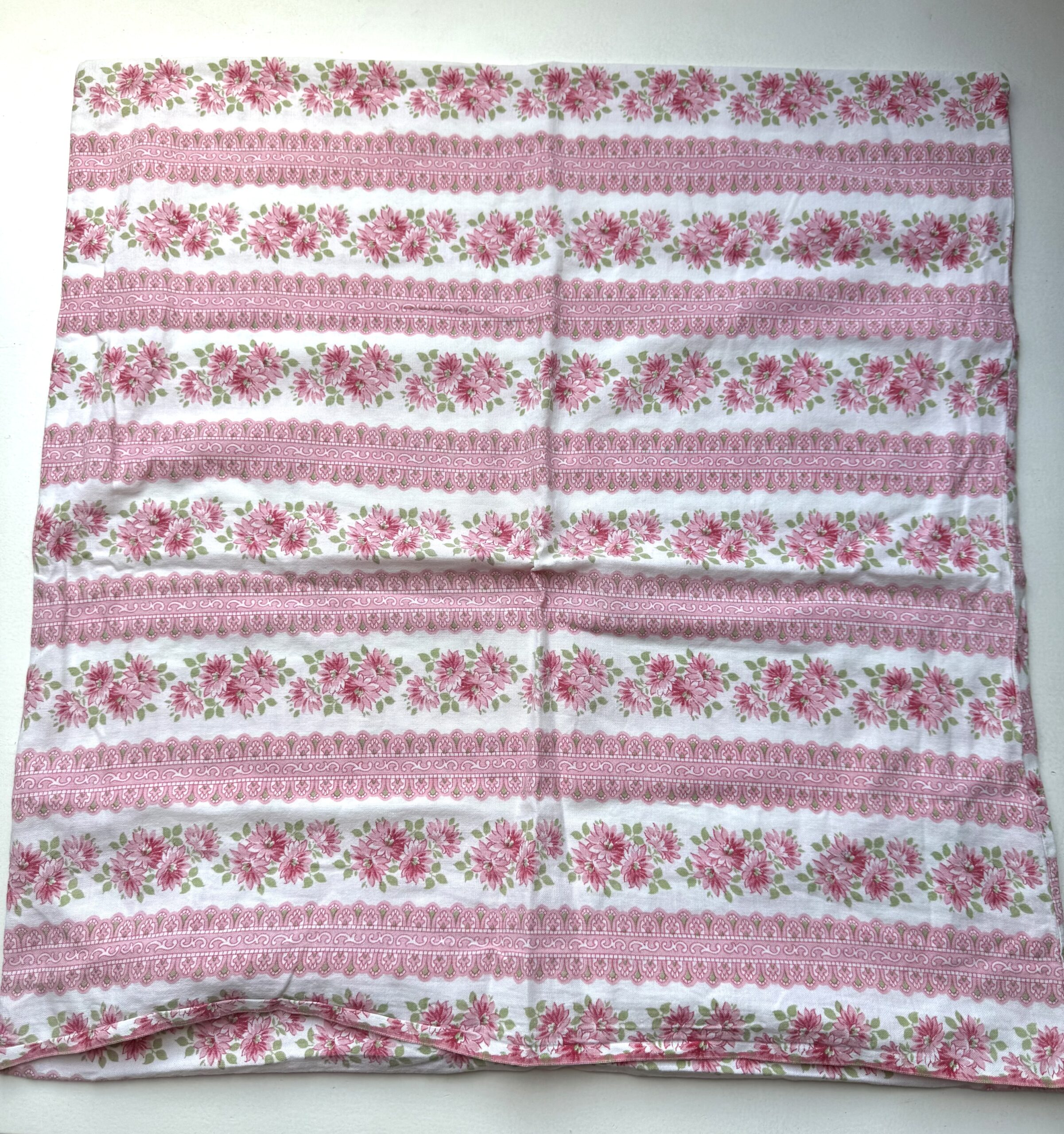 Flot retro pudebetræk med blomstermønster med rosa, pink og grønne nuancer på hvid baggrund.