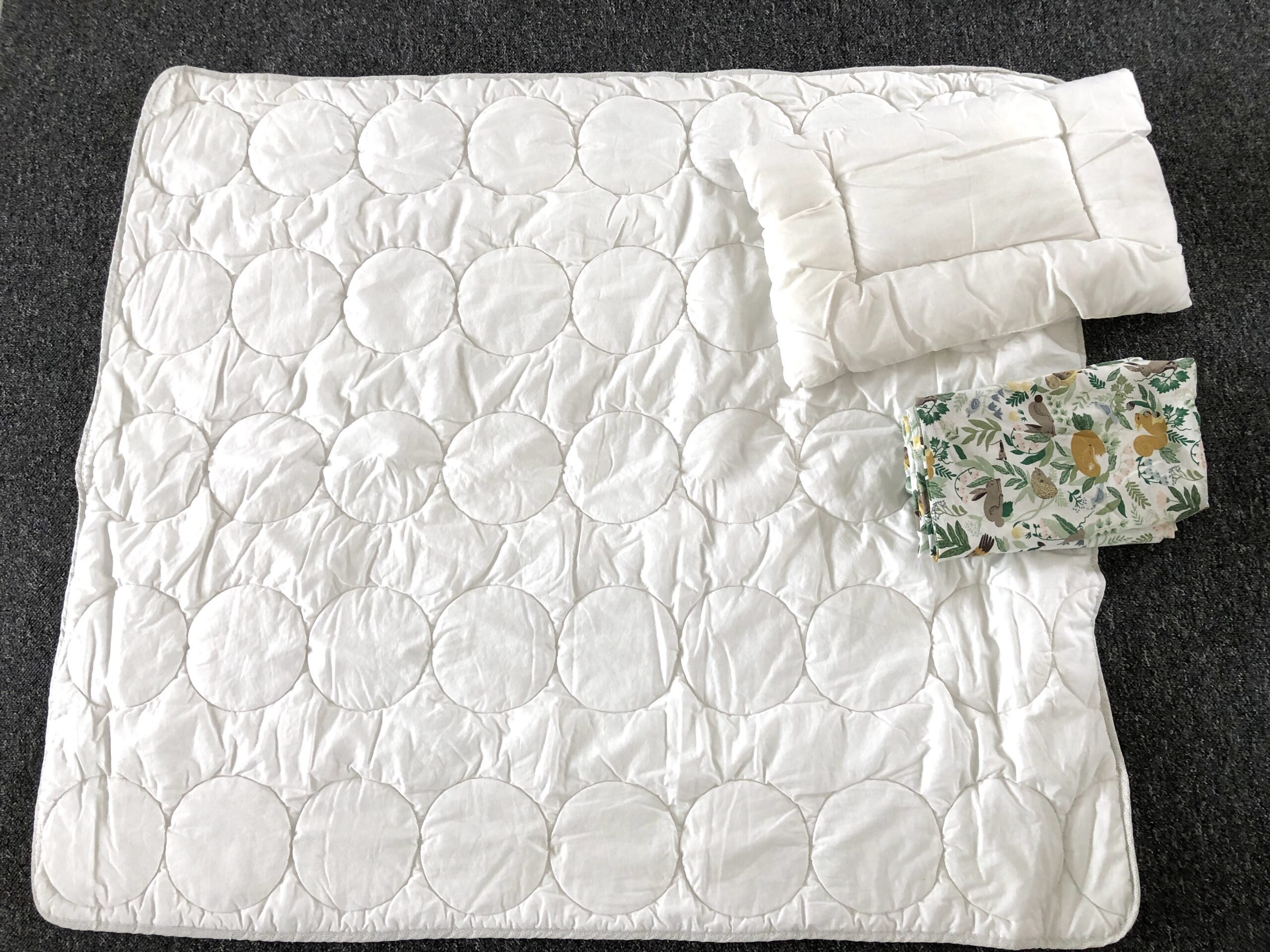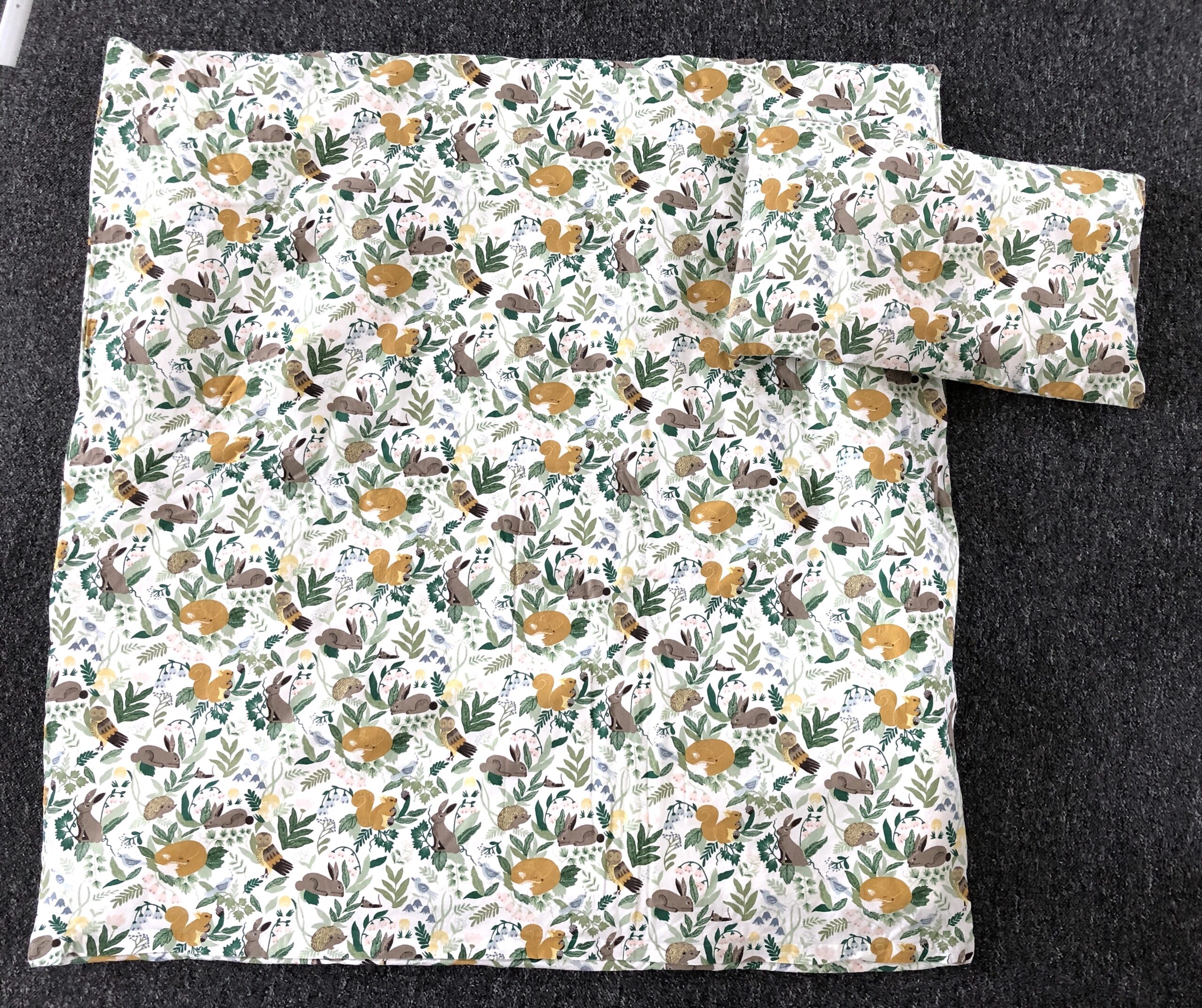 Dyne og hovedpude med betræk med skovens dyr.