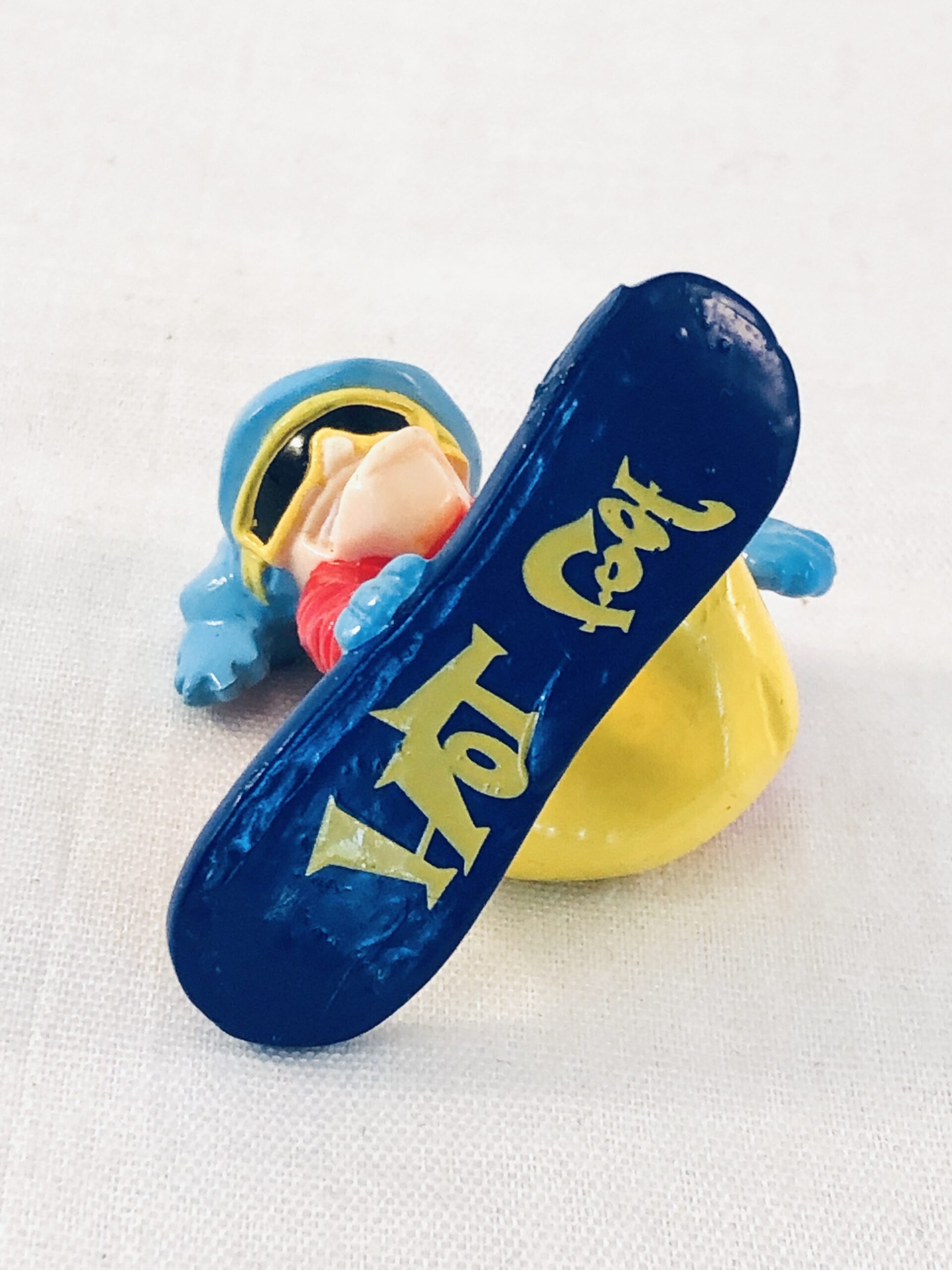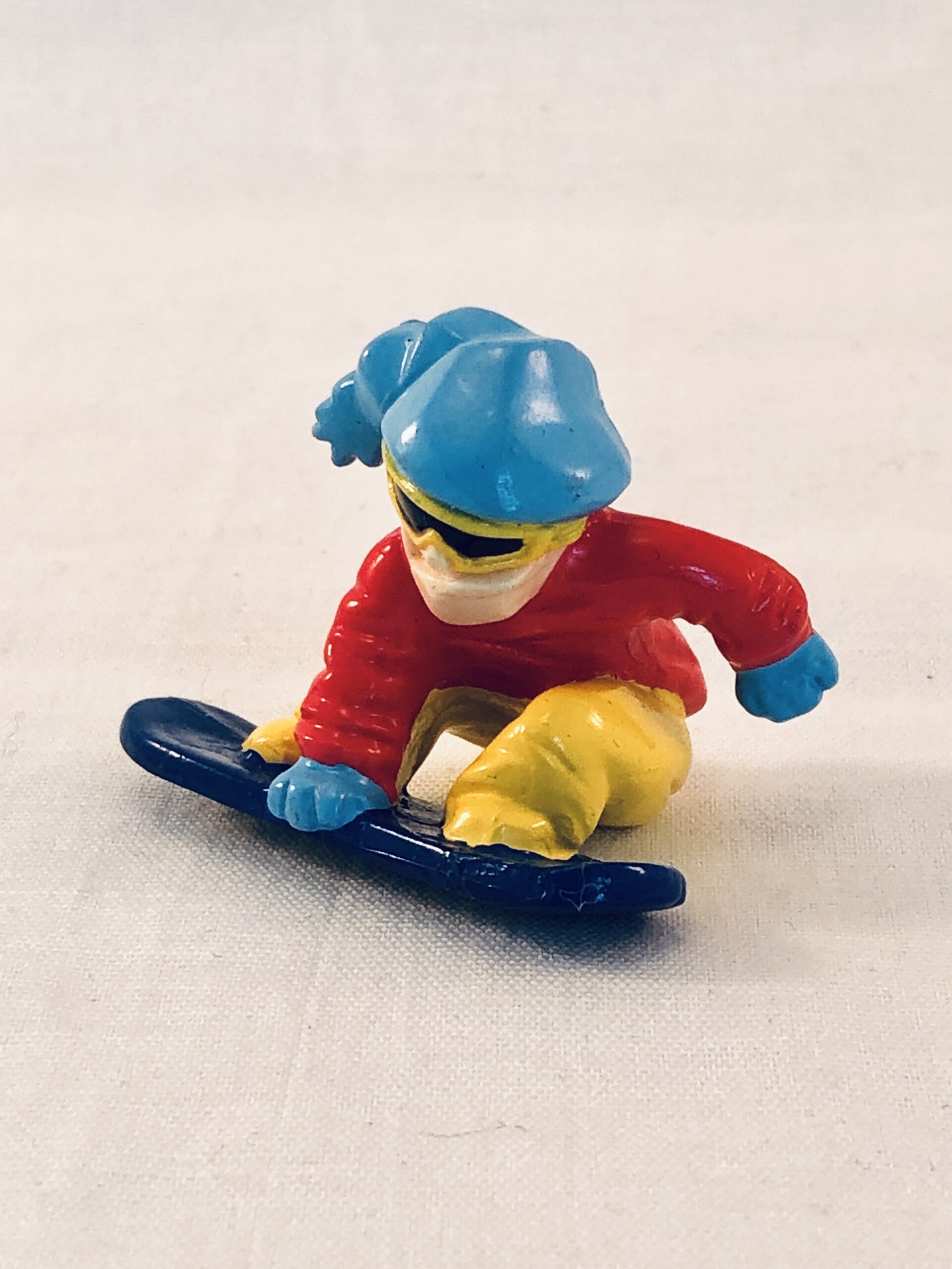 Snowboarder i farverigt outfit med “Hot” på boardet.
