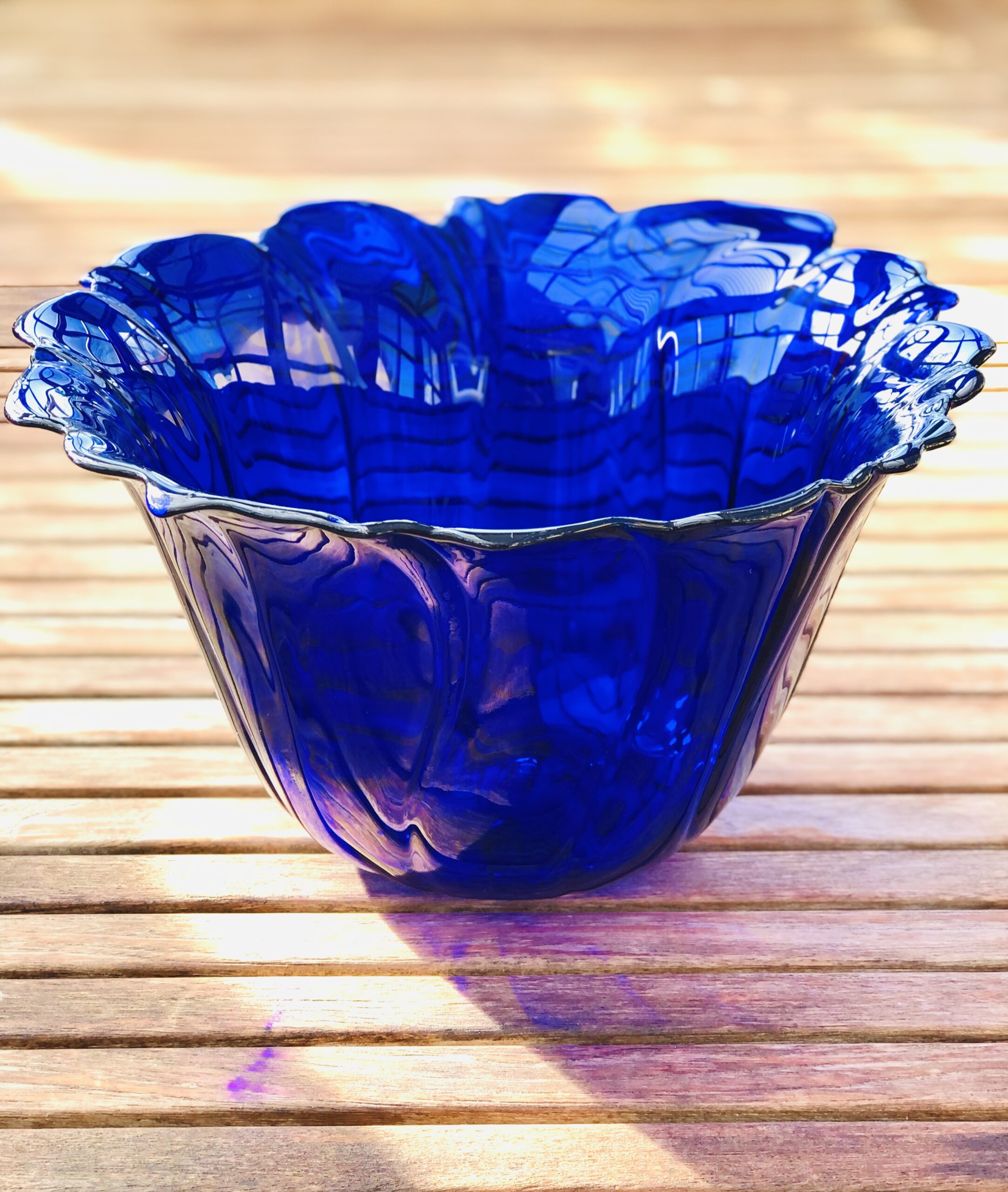 Stor smuk glasskål med bølget kant og swirl.