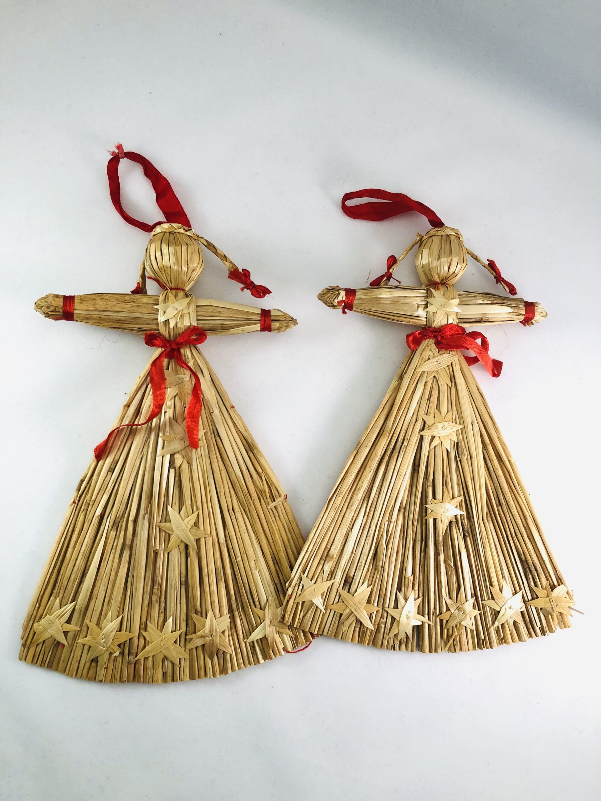 2 store gamle halmengle / stråengle med røde bånd.