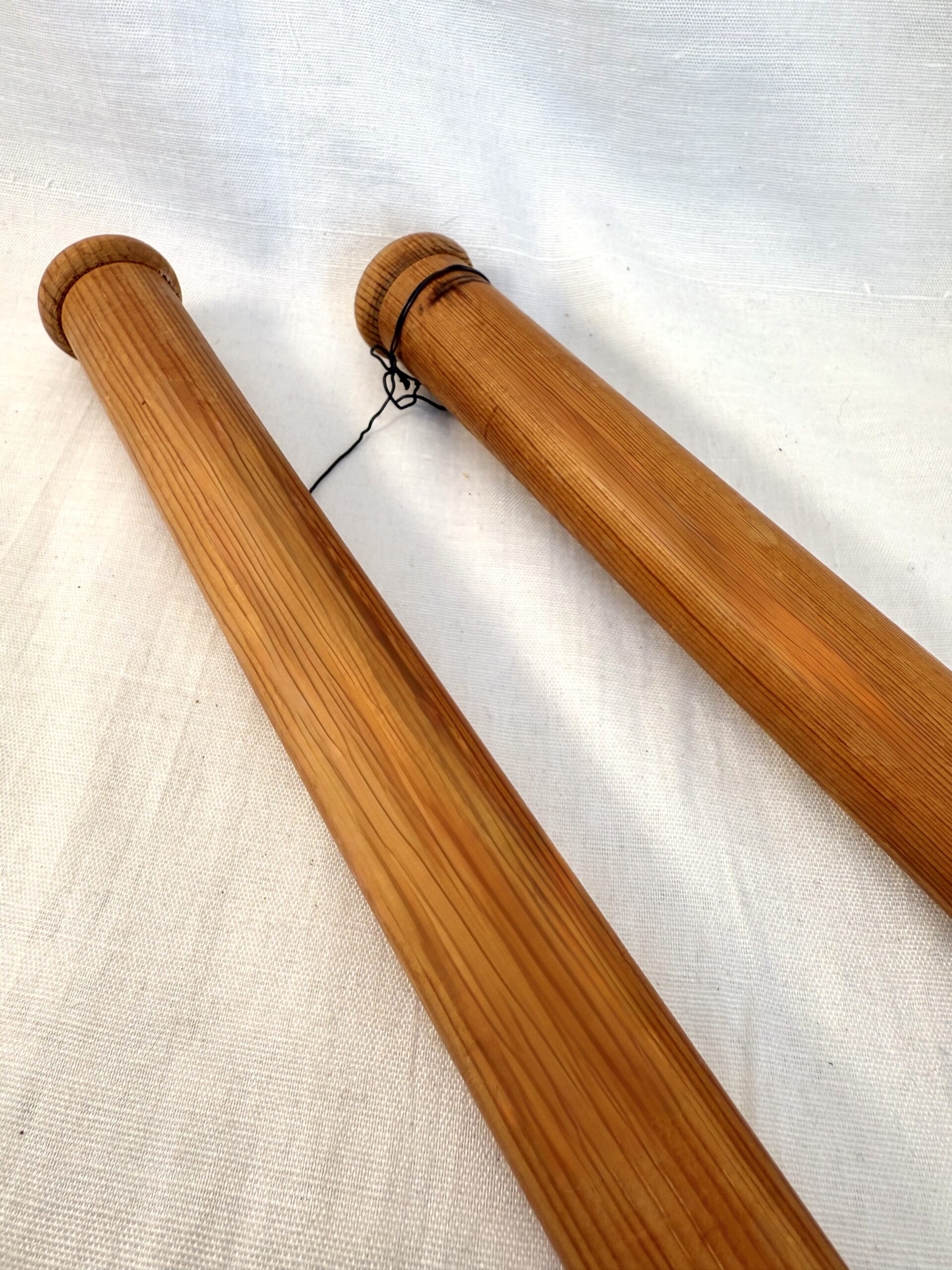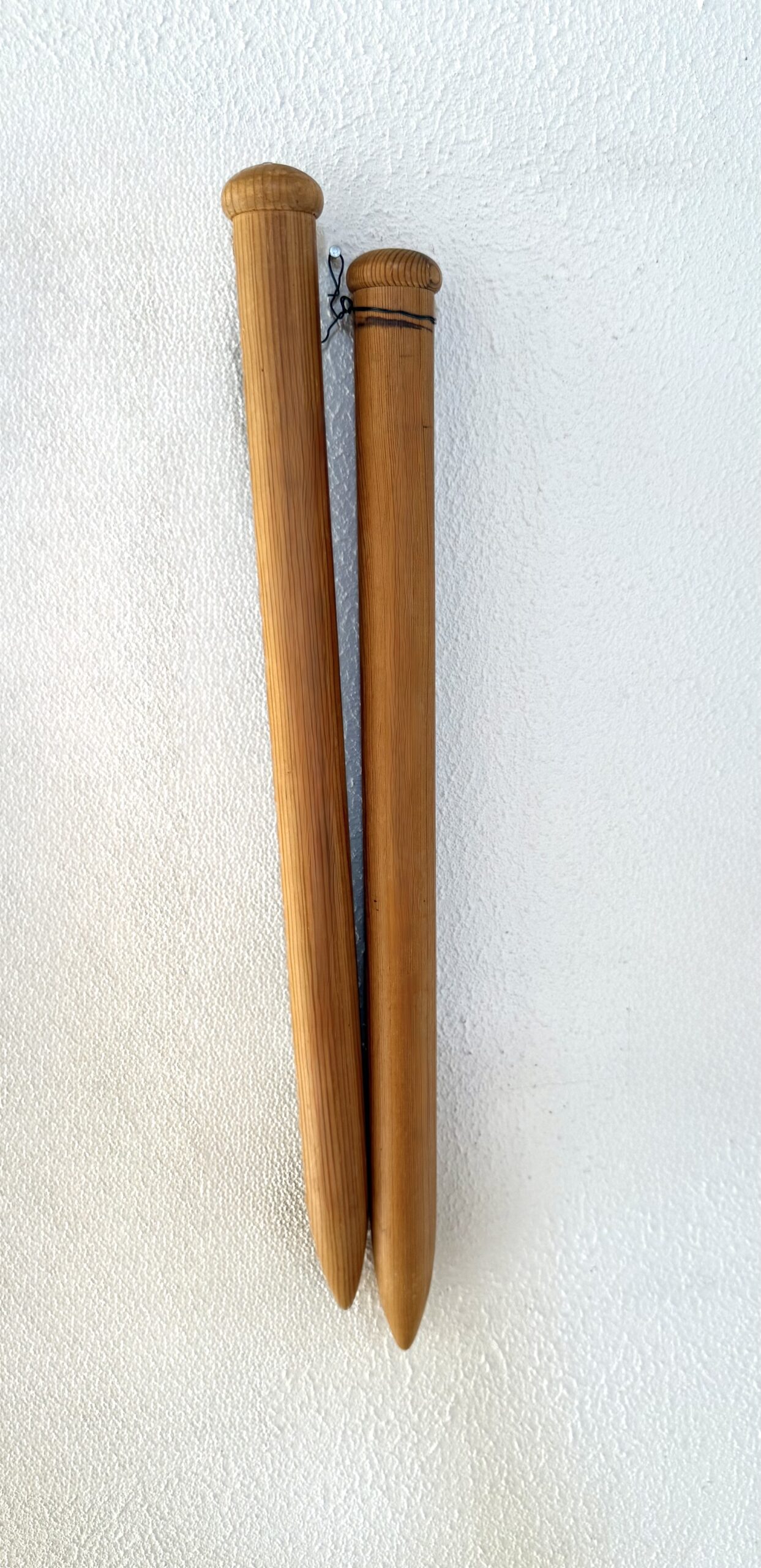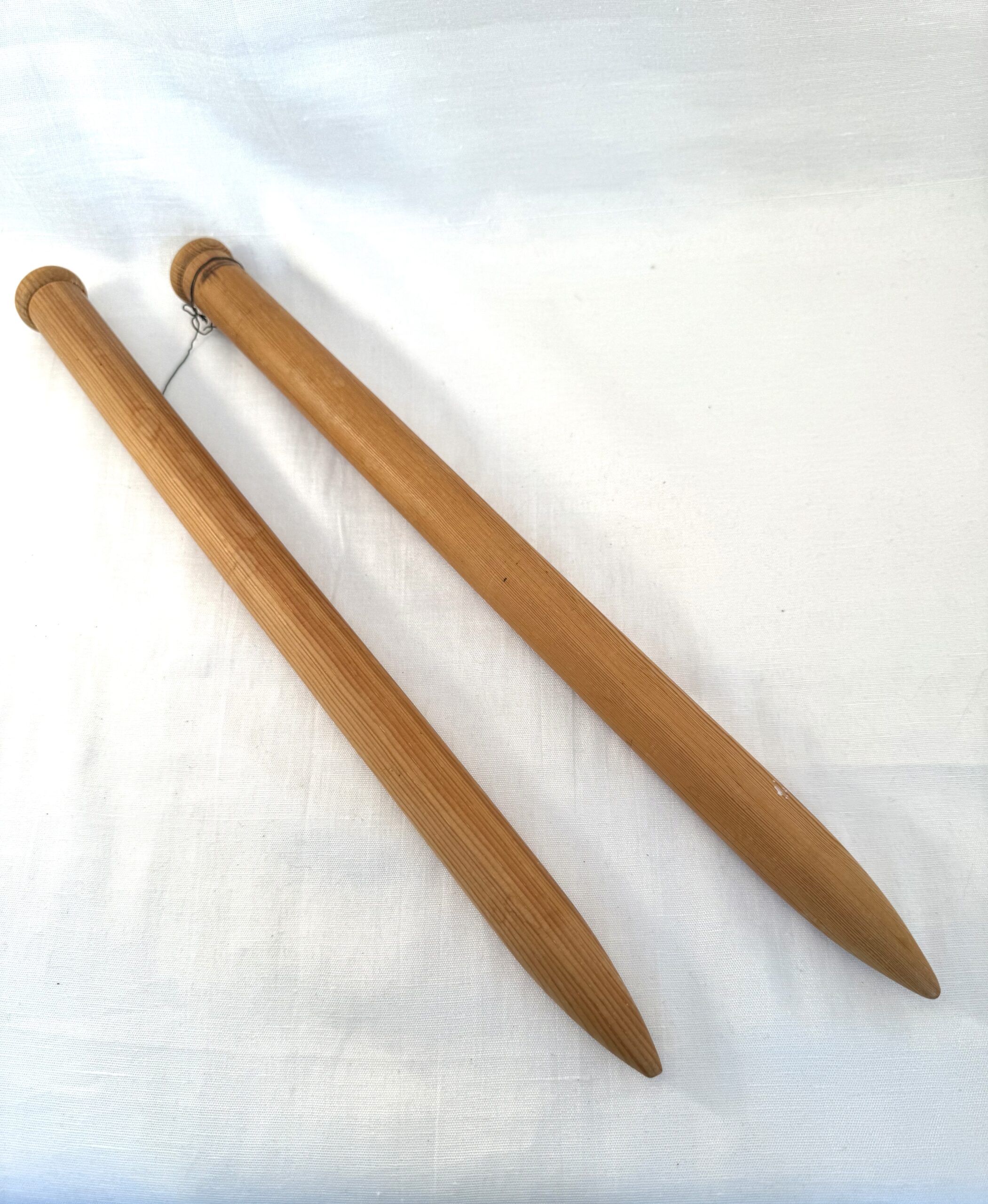 Flot sæt stor strikkepinde i træ med fin glød og patina.