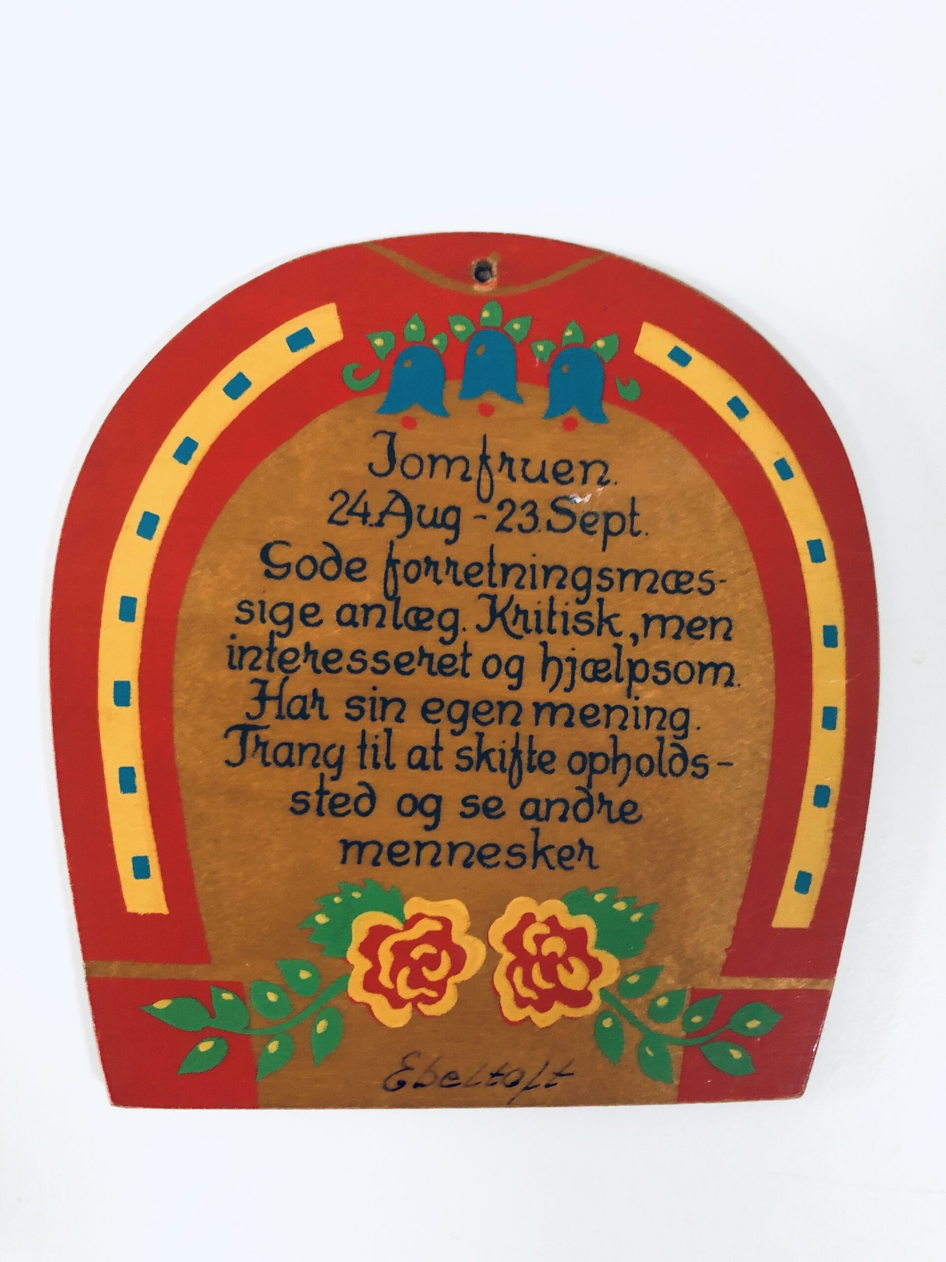 Smukt håndmalet træskilt med horoskopbeskrivelse for Jomfruen.